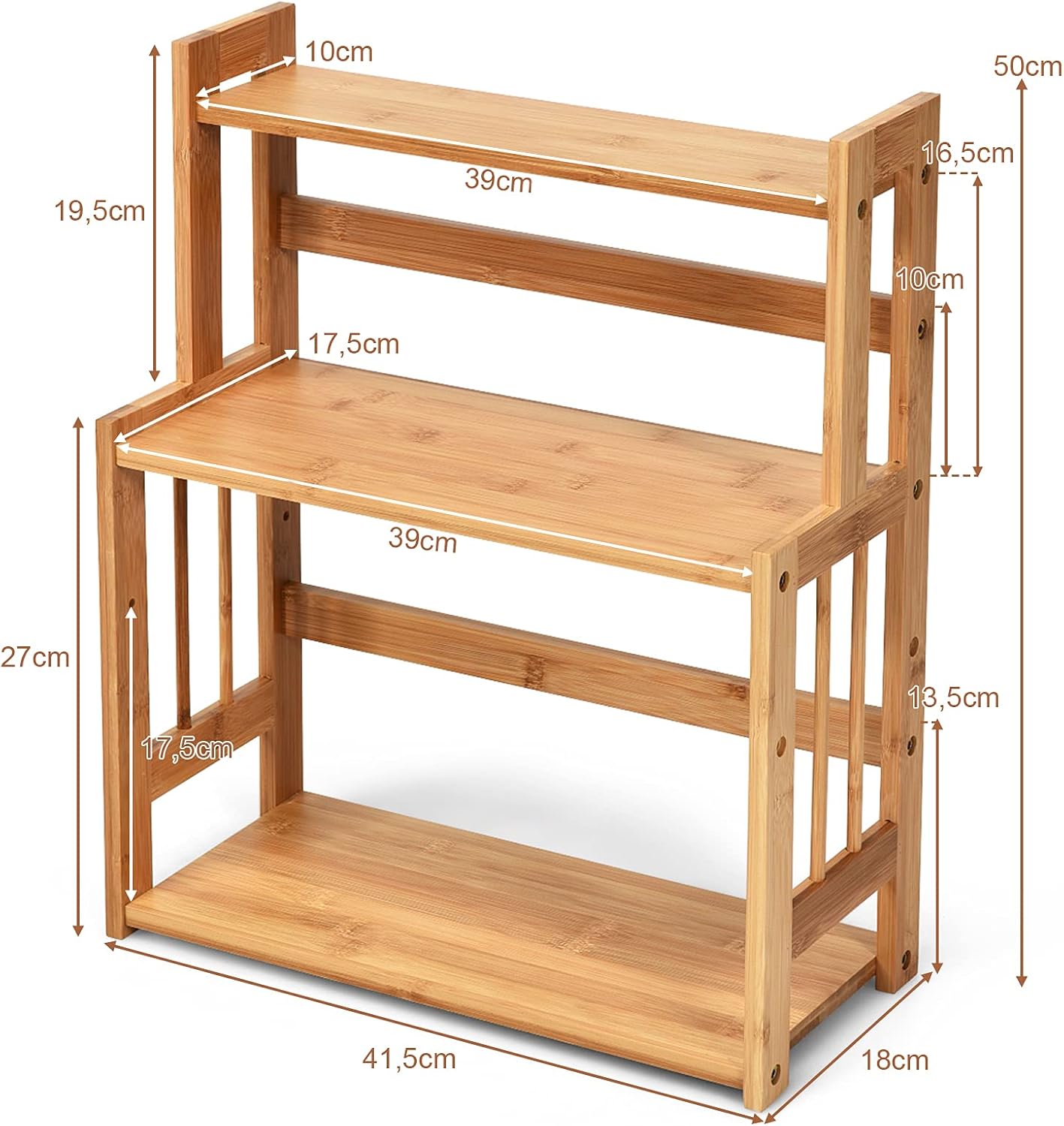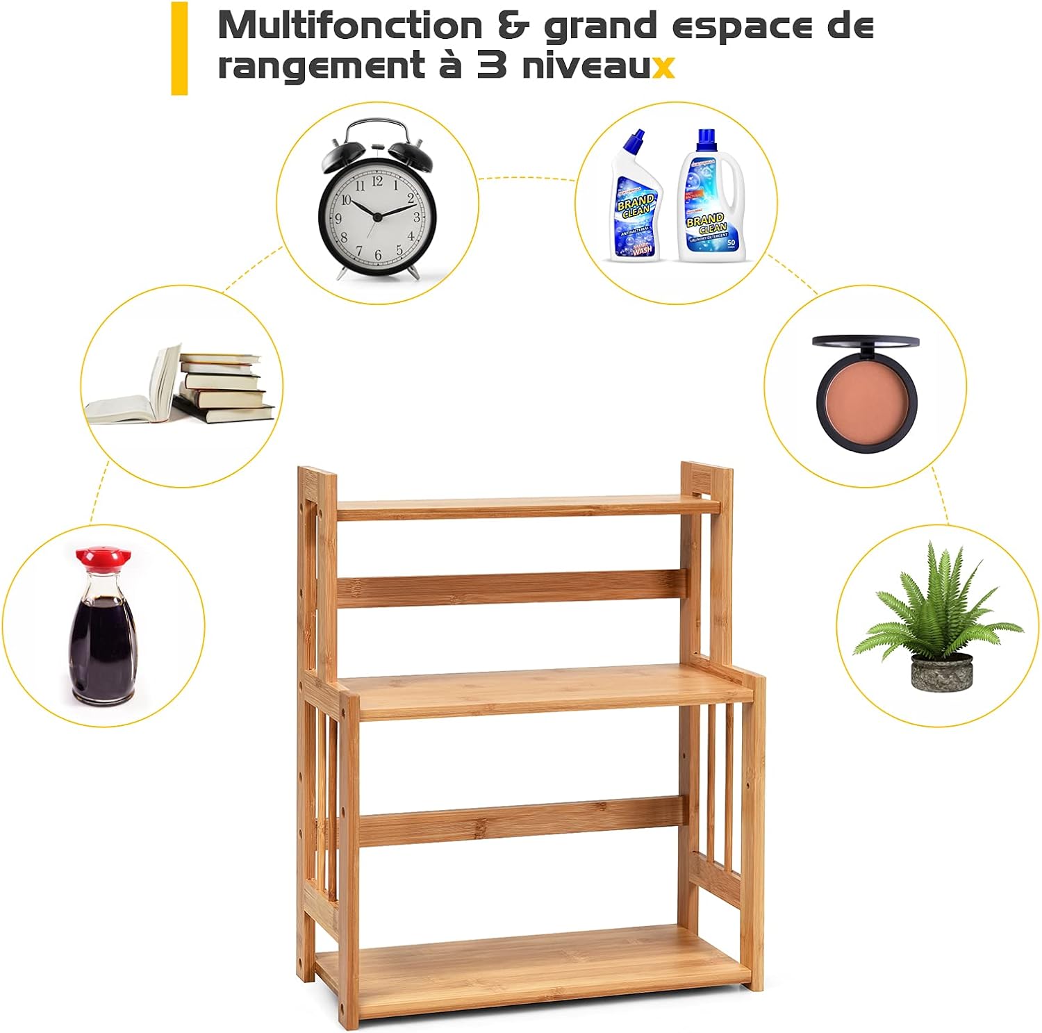 • Suffisamment d’espace : L’étagère à 3 niveaux vous propose suffisamment d’espace de rangement. De plus, elle a une bonne capacité de charge allant jusqu’à 20kg.Vous pouvez mettre les pots à épices sur la tablette en haut. Les grands articles comme les bouteilles d’huiles peuvent se placer sur les étagères en baspour la stabilité.