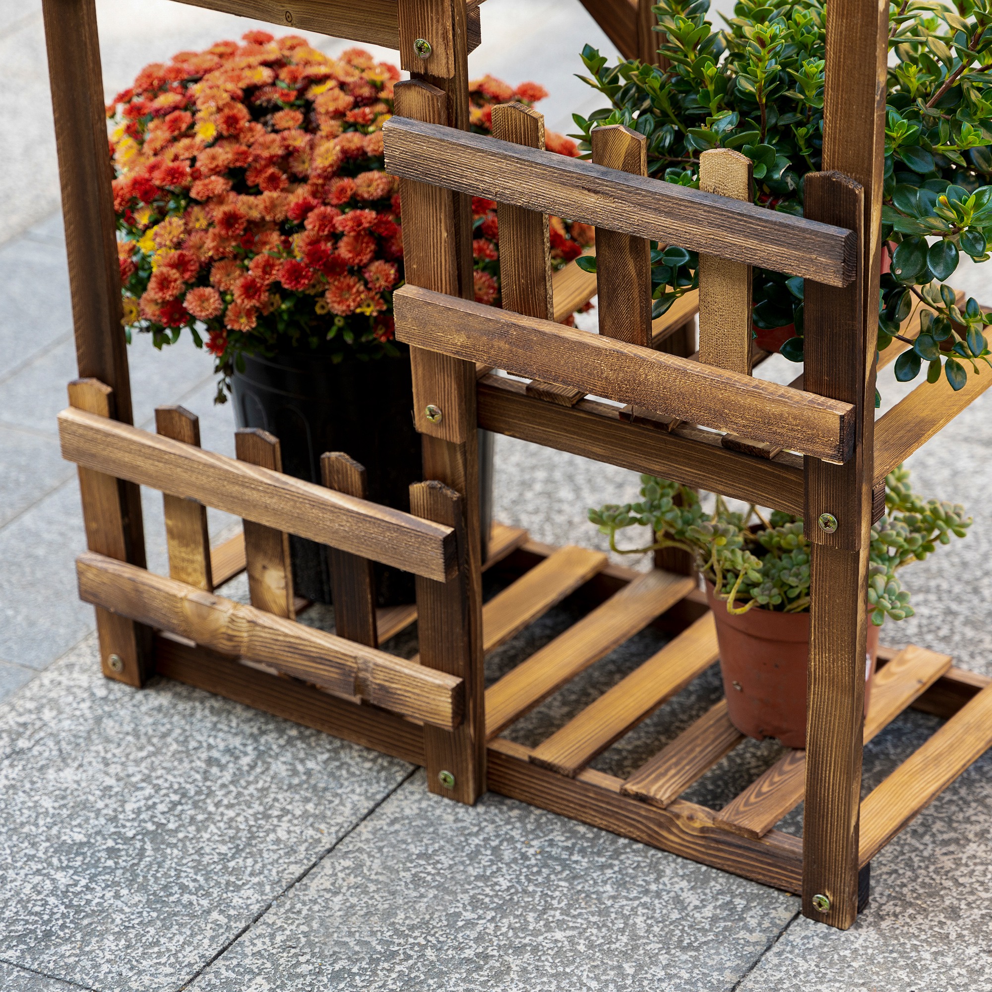 Cette superbe étagère à fleurs équipée de 5 tablettes multi-niveaux en bois de sapin traité par carbonisation ornées de petites barrières vous permettra de mettre en valeur vos fleurs et de décorer votre balcon, terrasse, jardin ou encore véranda.
