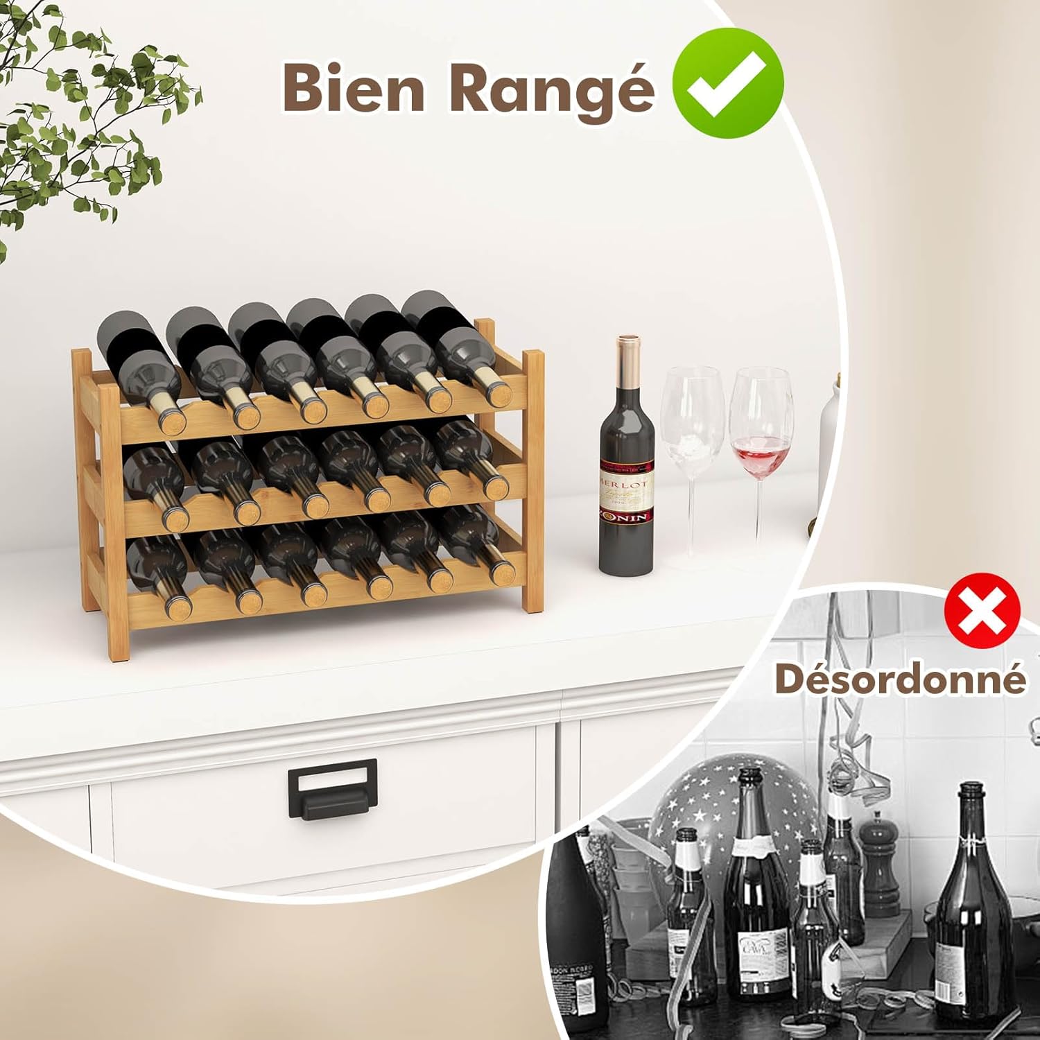 | Libellé | Etagère à vin en bambou à 3 niveaux pour 18 bouteilles de vin, range bouteilles de vin autoportant |