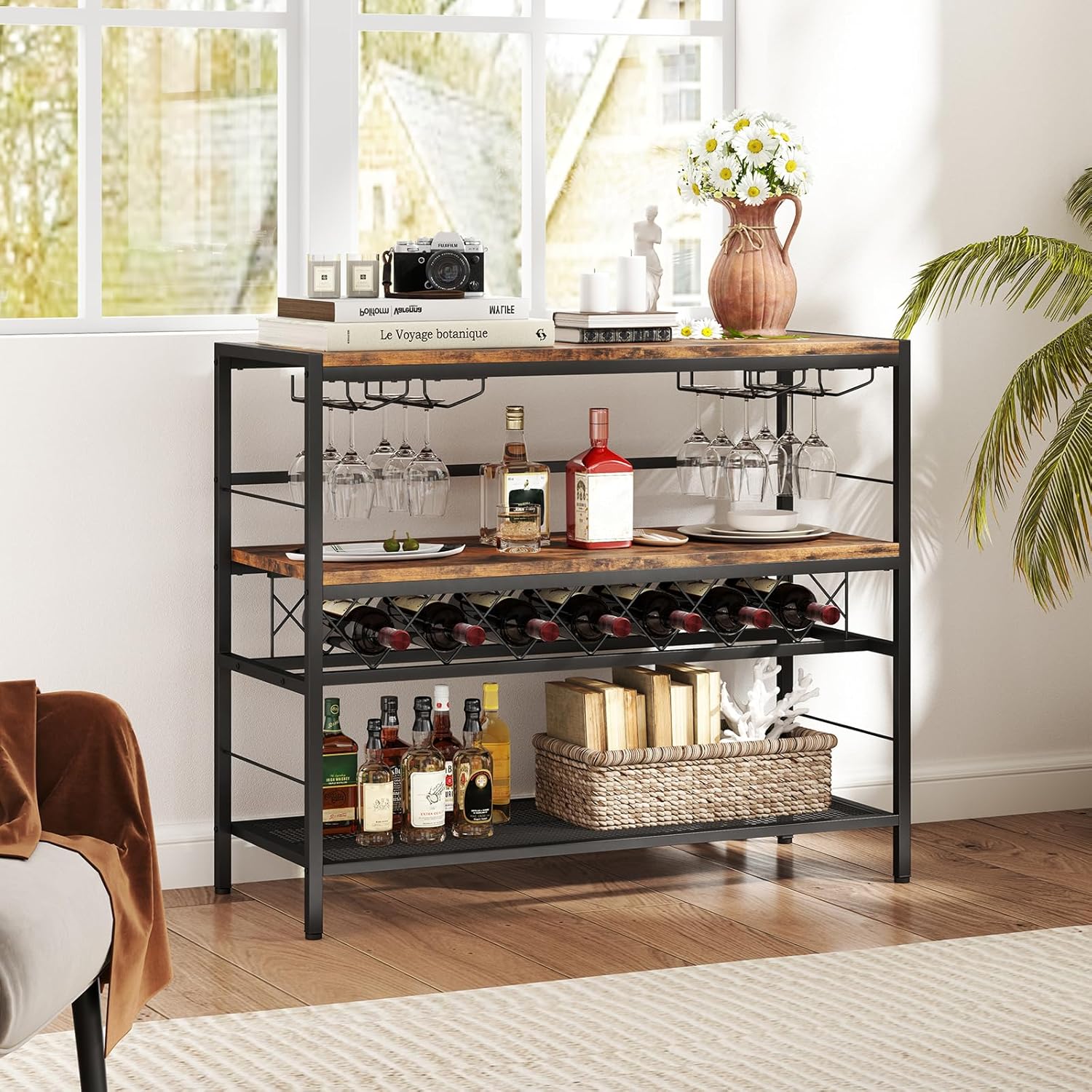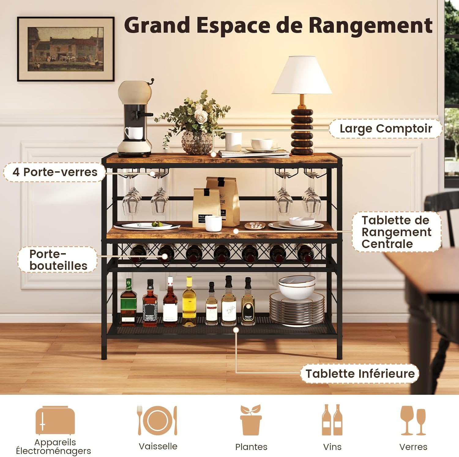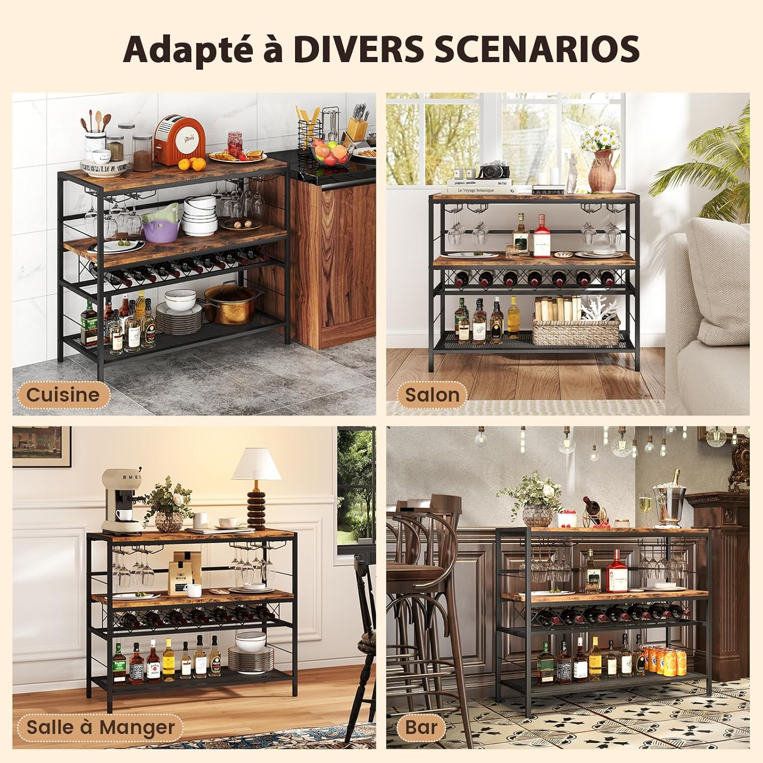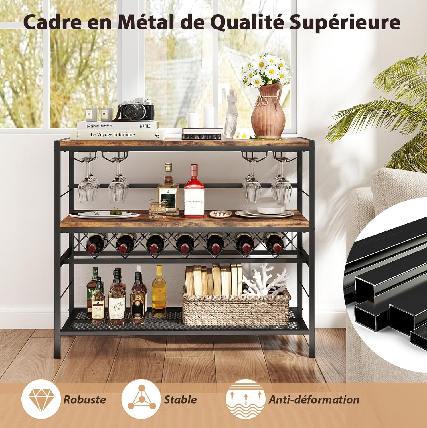 | Libellé | Étagère à vin pour 7 bouteilles, meuble de bar à vin 4 supports de verre, large plateau, marron rustique |