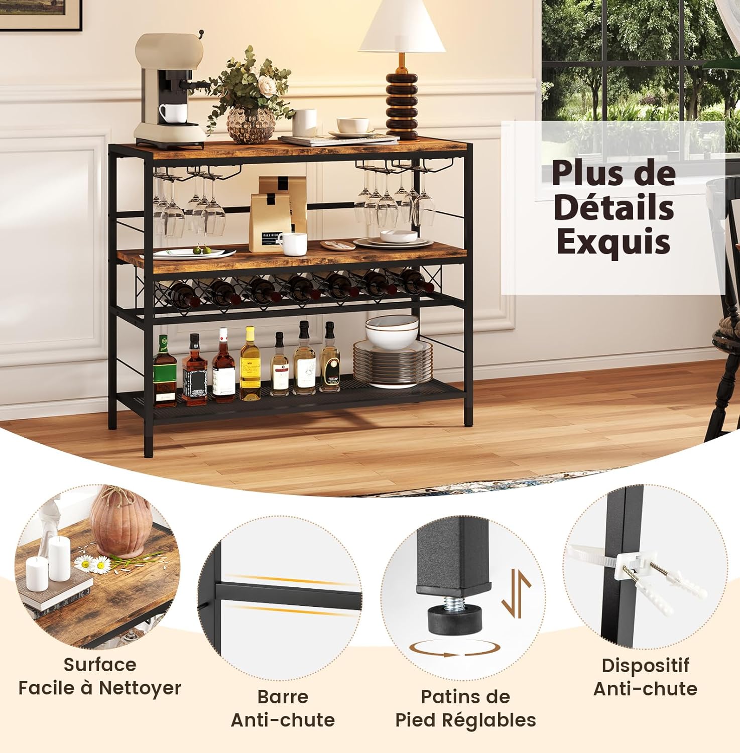 - Conception Sûre et Stable : Equipée de pieds réglables et d'une barre antichute, ce meuble à vin garantit que vos bouteilles de vin, verres et autres articles restent en sécurité à tout moment. Le dispositif antichute qui fixe la table au mur améliore encore sa stabilité, ce qui en fait un ajout sûr.