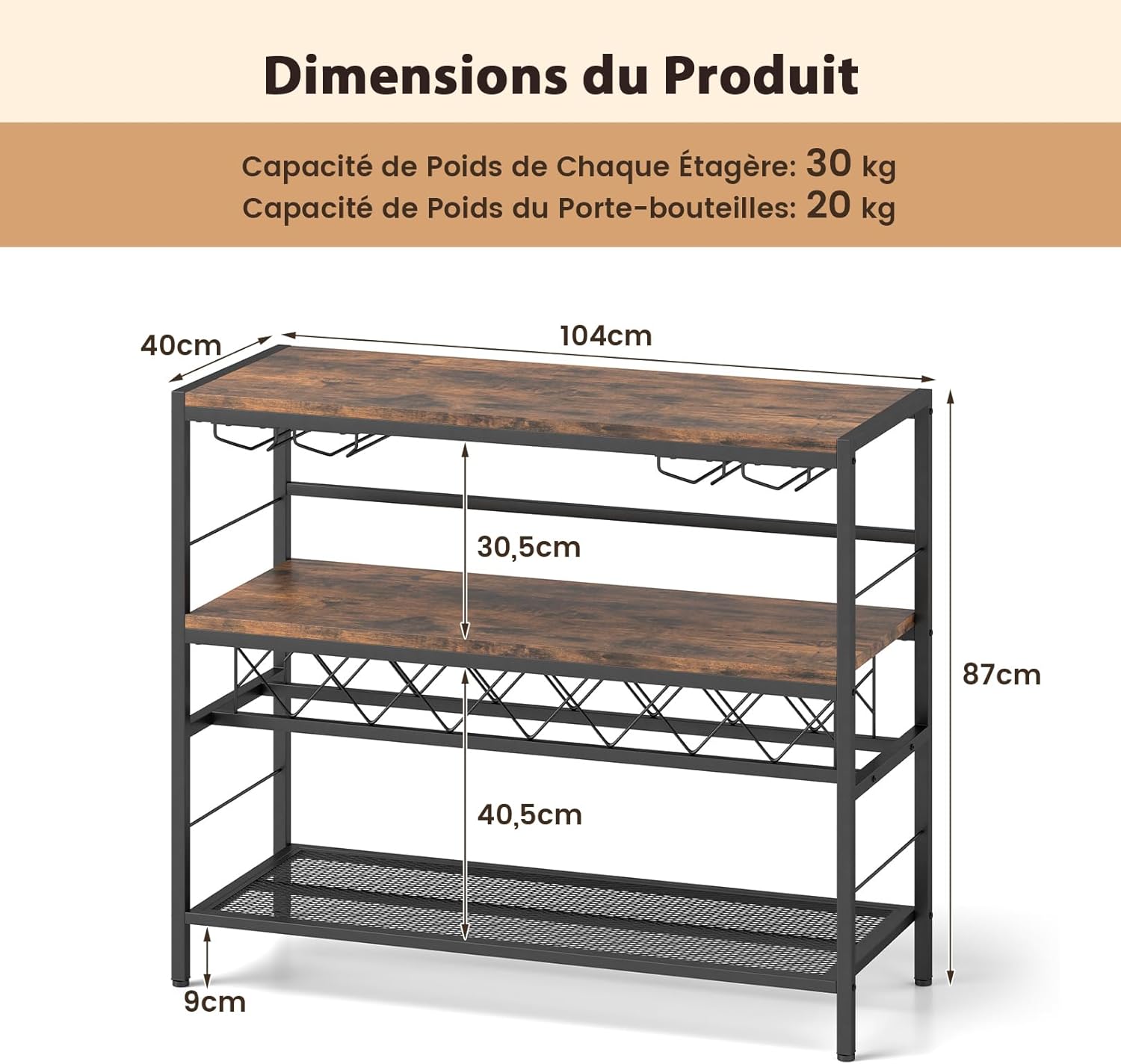 - Grand Espace de Rangement : Notre étagère à vin équipée d'un porte-bouteilles de vin et de 4 rangées de porte-verres pour placer 7 bouteilles de vins et 20 verres. Les 3 étagères vous aident à stocker et à trier différents articles de manière ordonnée pour créer un environnement propre.