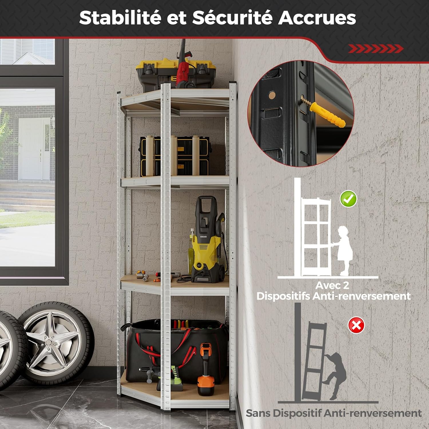 Maximisez votre espace dans n'importe quel coin de votre maison avec notre étagère d'angle à 4 niveaux. Polyvalente, elle est parfaite pour votre entrepôt, garde-manger, remise ou cuisine. Les 4 tablettes réglables permettent de personnaliser la hauteur pour différents articles. Qu'il s'agisse de ranger des outils, des conserves, des fournitures ou autres, elle garde votre espace organisé. Avec une capacité de 720 kg, elle offre une stabilité garantissant des années d'utilisation fiable. Livrée avec 2 kits anti-basculement, vous pouvez l’ancrer au mur, évitant ainsi tout basculement.