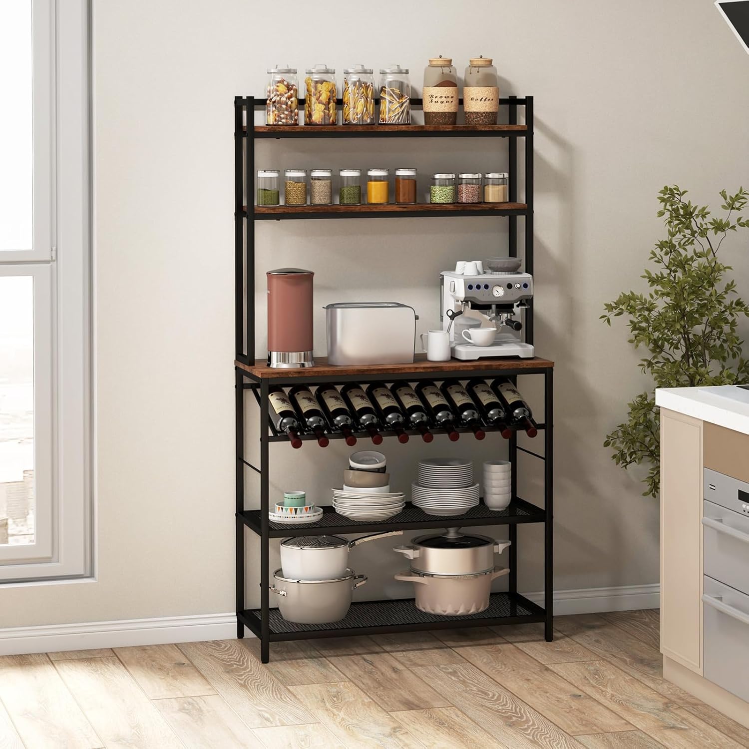 Etagère de cuisine 6 niveaux support micro-ondes autoportant, porte-bouteille vin incliné,marron rustique