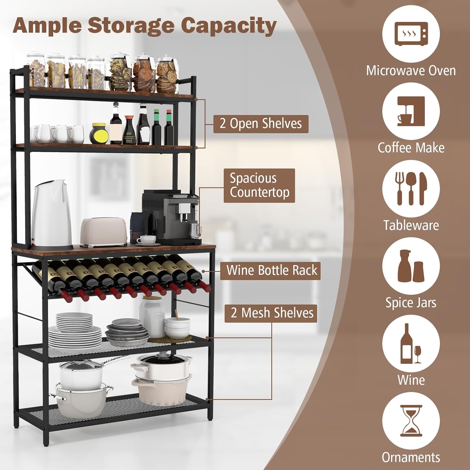 - Solution de rangement parfaite : Notre étagère de cuisine comprend des étagères ouvertes à 2 niveaux, un plan de travail spacieux de 90 cm (L) x 35 cm (l) et des étagères en maille à 2 niveaux pour un espace de stockage suffisant. Vous pouvez l'utiliser pour placer de la vaisselle, des bouteilles de vin, des petits appareils de cuisine ou des ornements, gardant votre pièce propre et bien rangée.