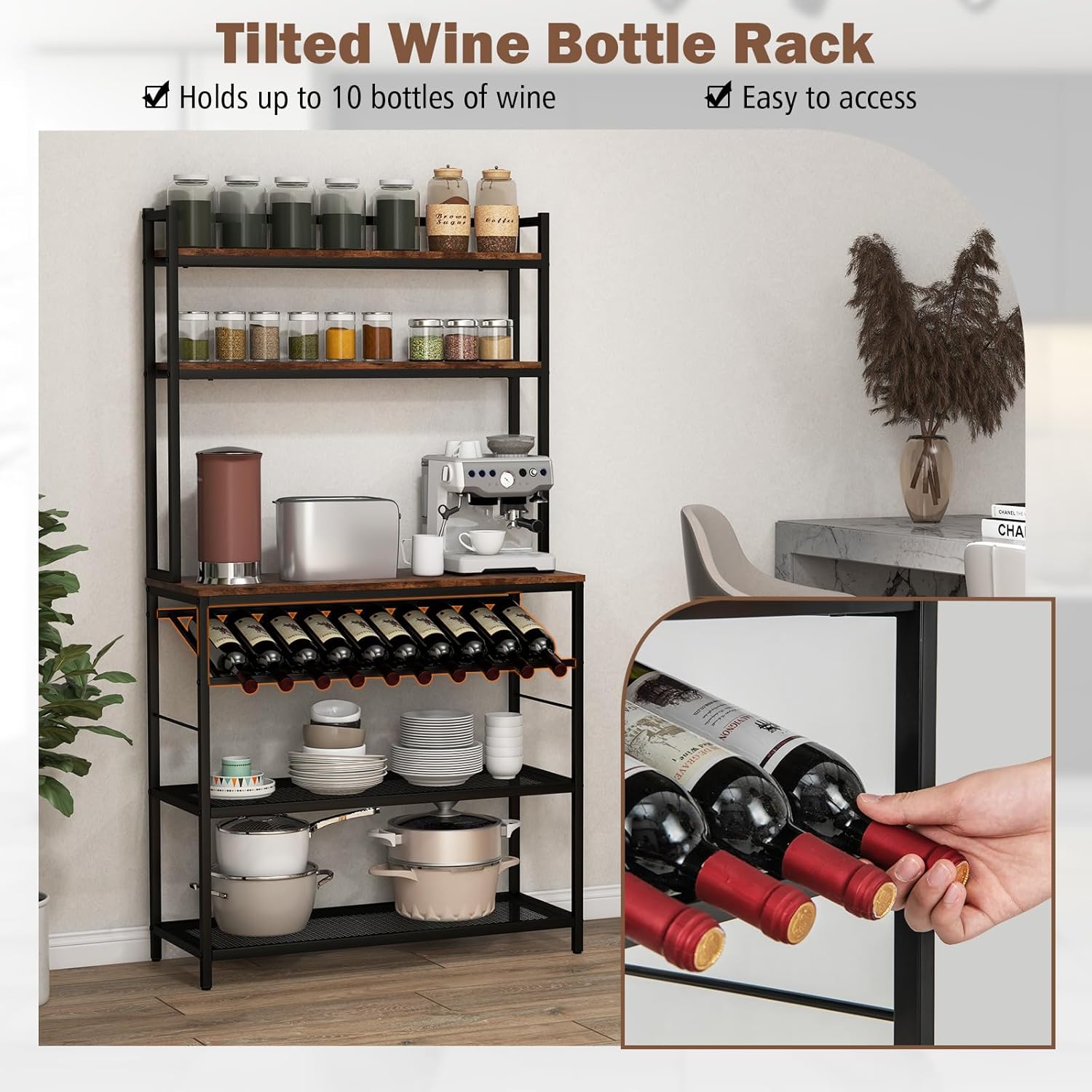 1 large comptoir, 2 tablettes solides et 2 tablettes grillagées pour un rangement trié1 casier à bouteilles de vin pour contenir 10 bouteilles de vin