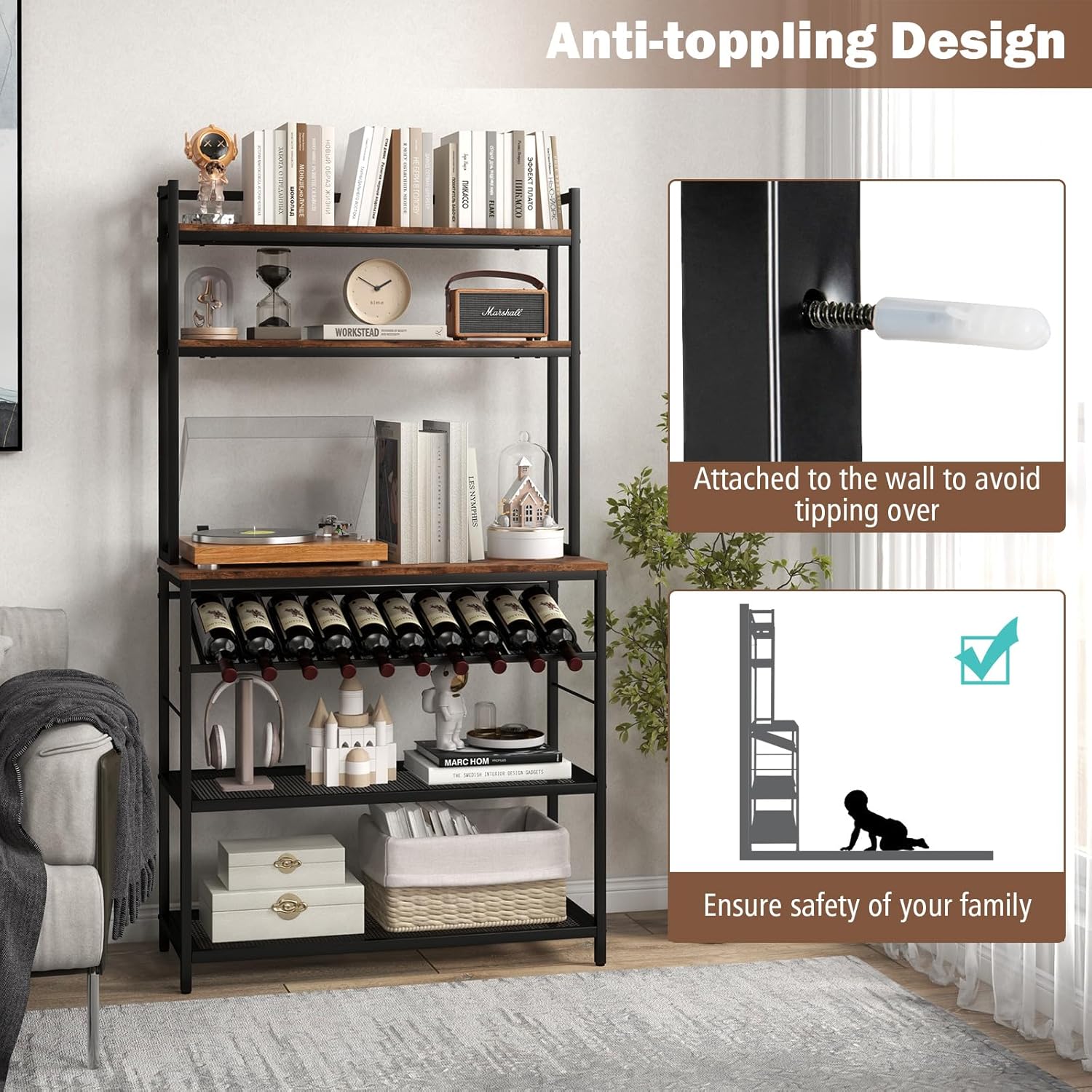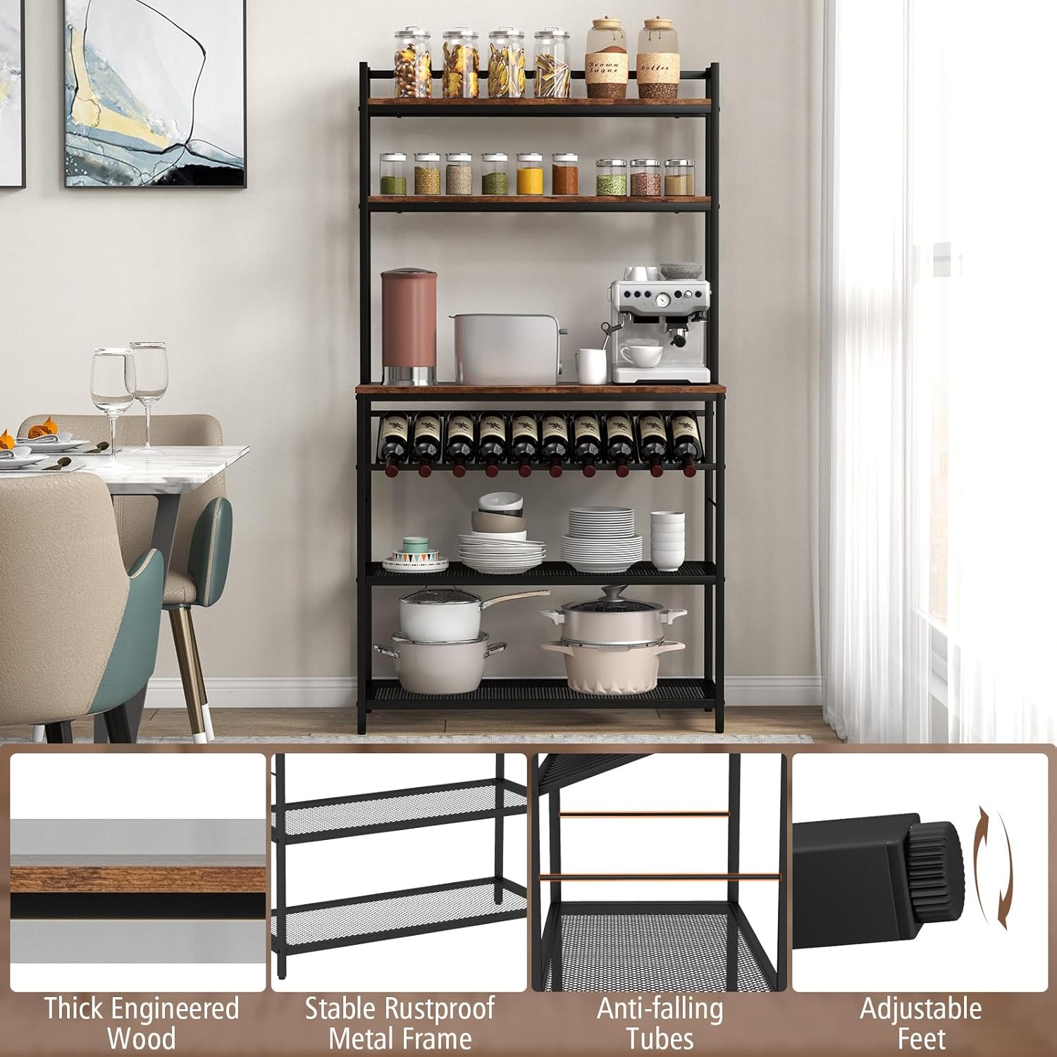 Gardez tout organisé avec notre étagère de cuisine de style industriel ! Elle comprend 1 comptoir, 1 casier à bouteilles de vin, 2 tablettes en bois et 2 tablettes grillagées pour répondre à vos besoins de rangement. Sa conception anti-renversement et les pieds réglables l’aident à rester stable. 2 tablettes et 1 comptoir sont recouverts de magnifiques grains de bois pour impressionner vos invités. Elle conviendra à la cuisine, à la salle à manger, au salon. De plus, elle est également très facile à assembler et à nettoyer, ce qui vous fera gagner du temps et de l'énergie.