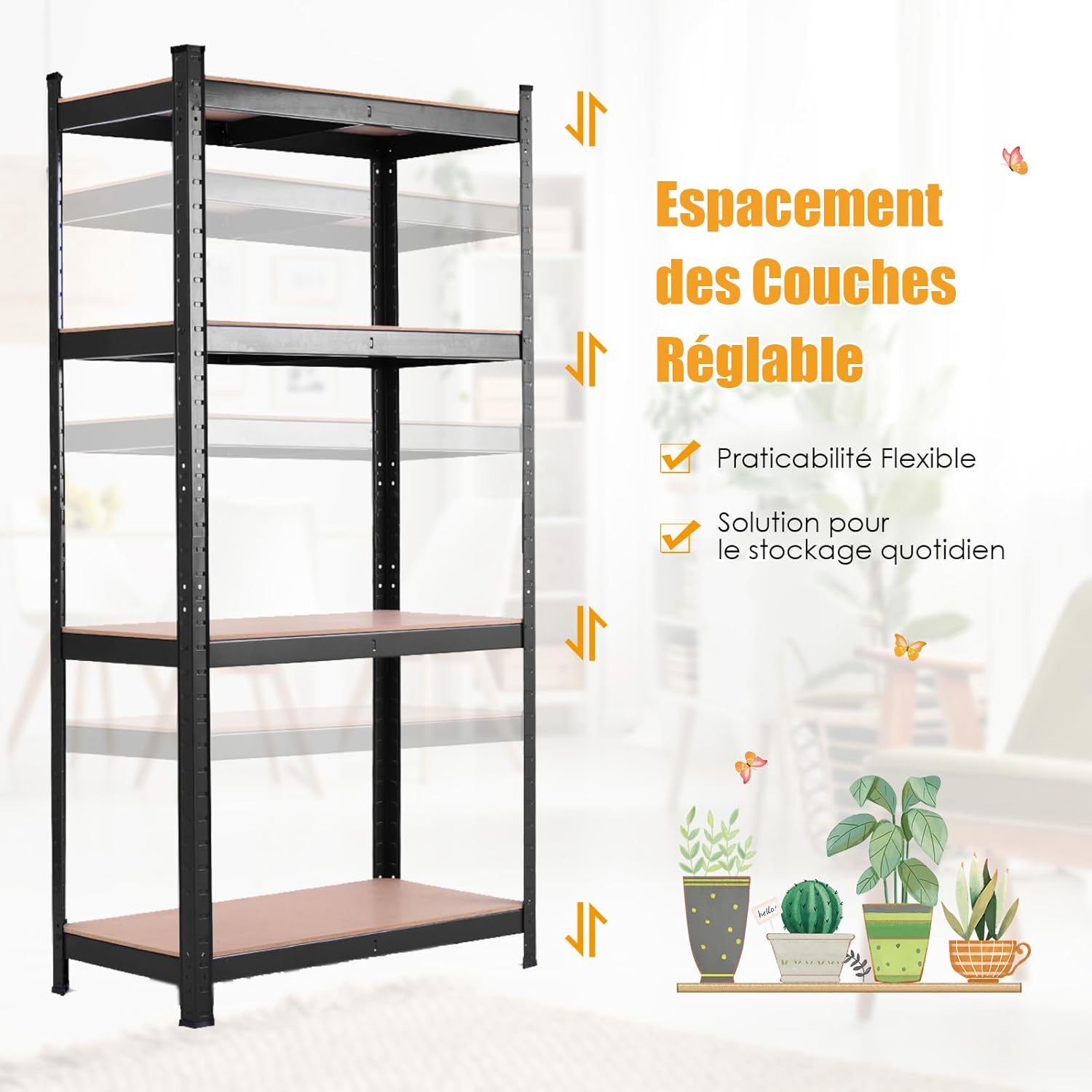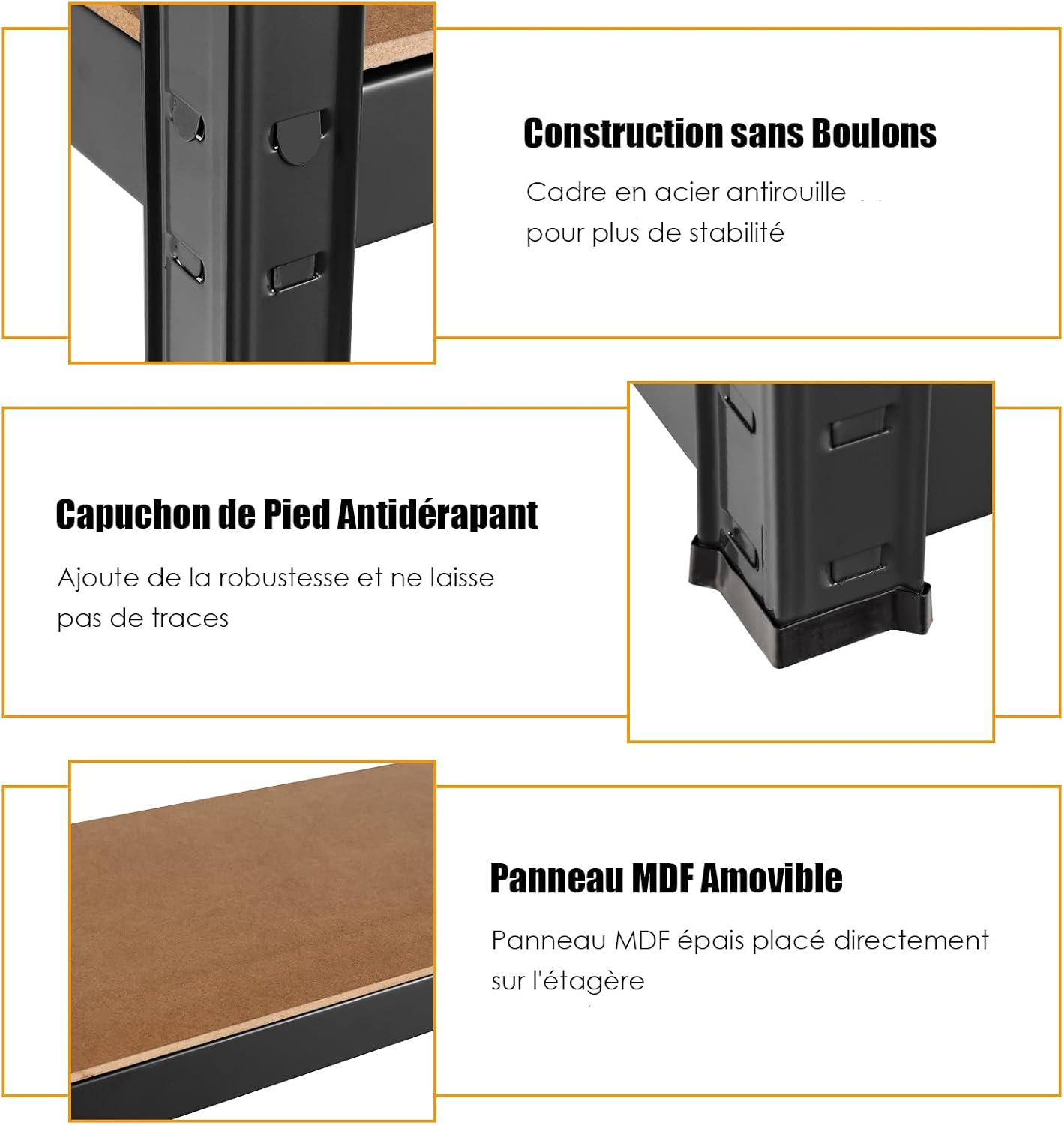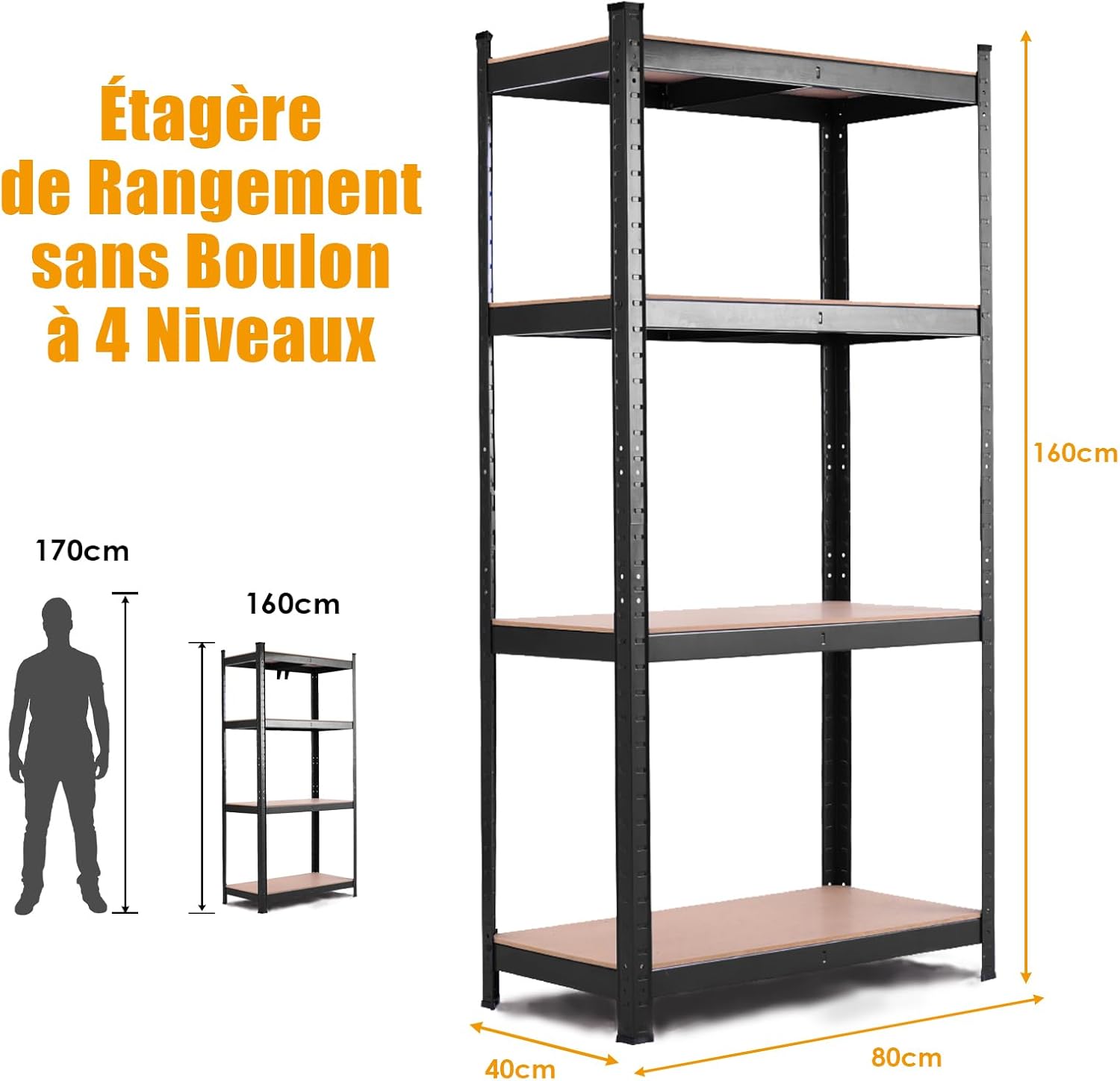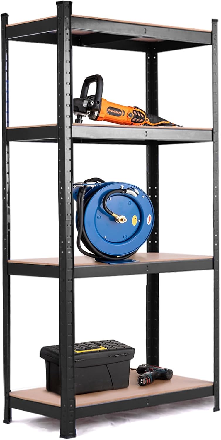 Libellé Etagère de rangement avec 4 étagères, garage, atelier, divers modèles, charge lourde en fer et mdf,noir