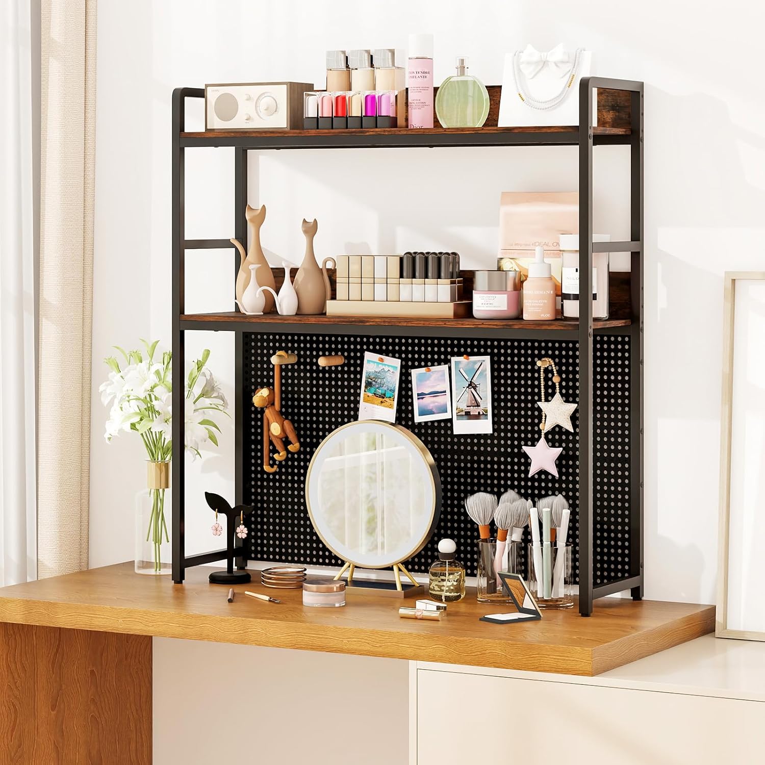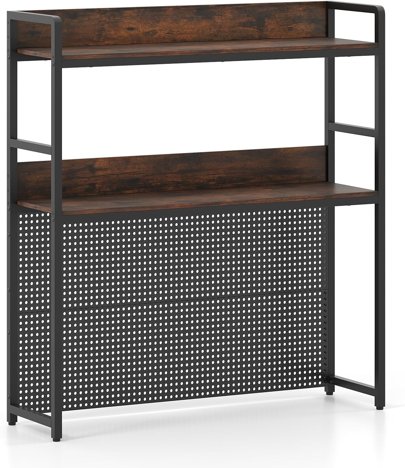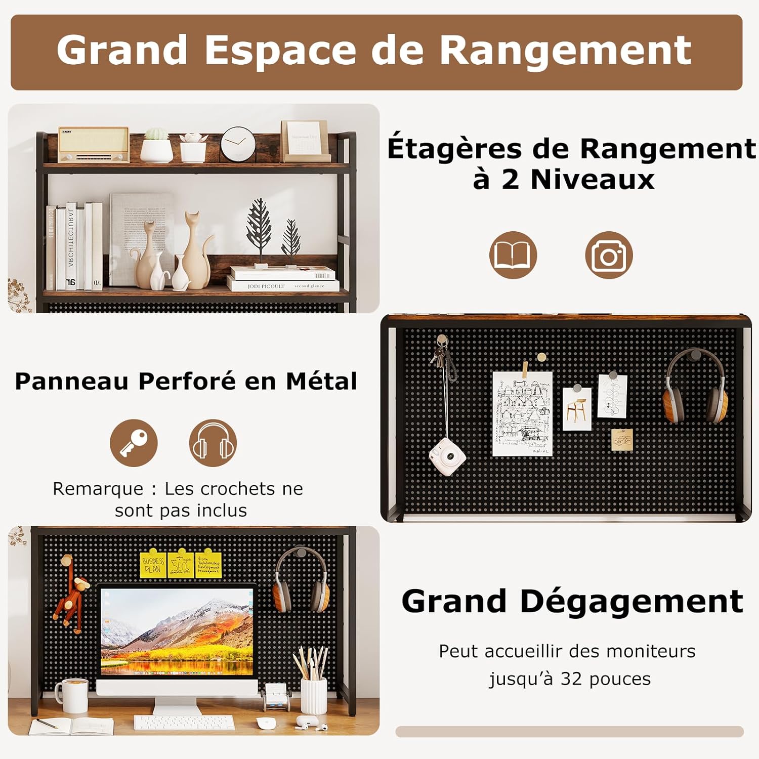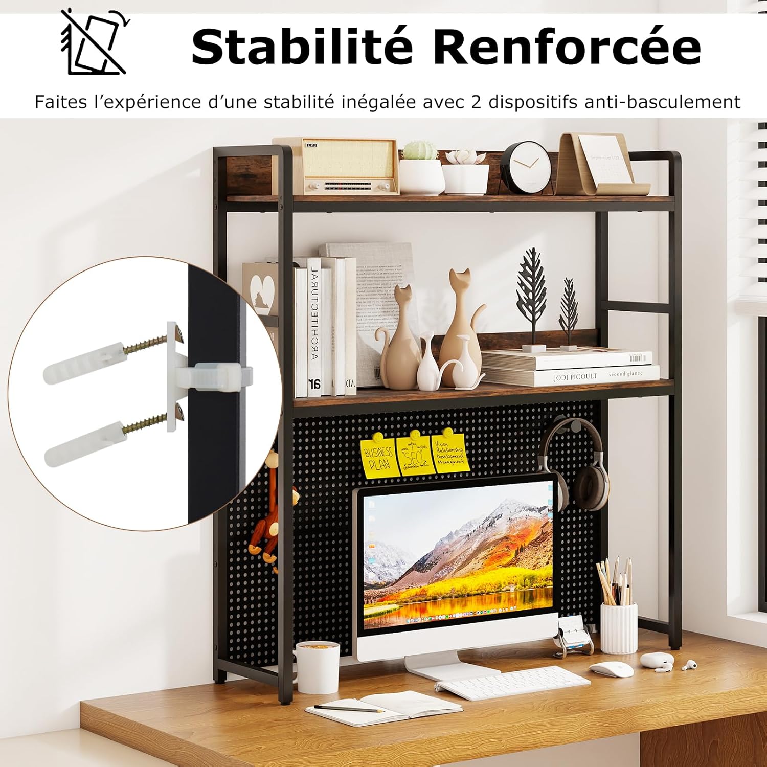 • Grand espace de rangement : Cette étagère de bureau est dotée de deux niveaux spacieux, parfaits pour exposer livres, photos et autres objets essentiels. De plus, elle comprend un panneau perforé en métal, idéal pour suspendre des objets tels que des clés et des écouteurs (remarque : les crochets ne sont pas inclus).