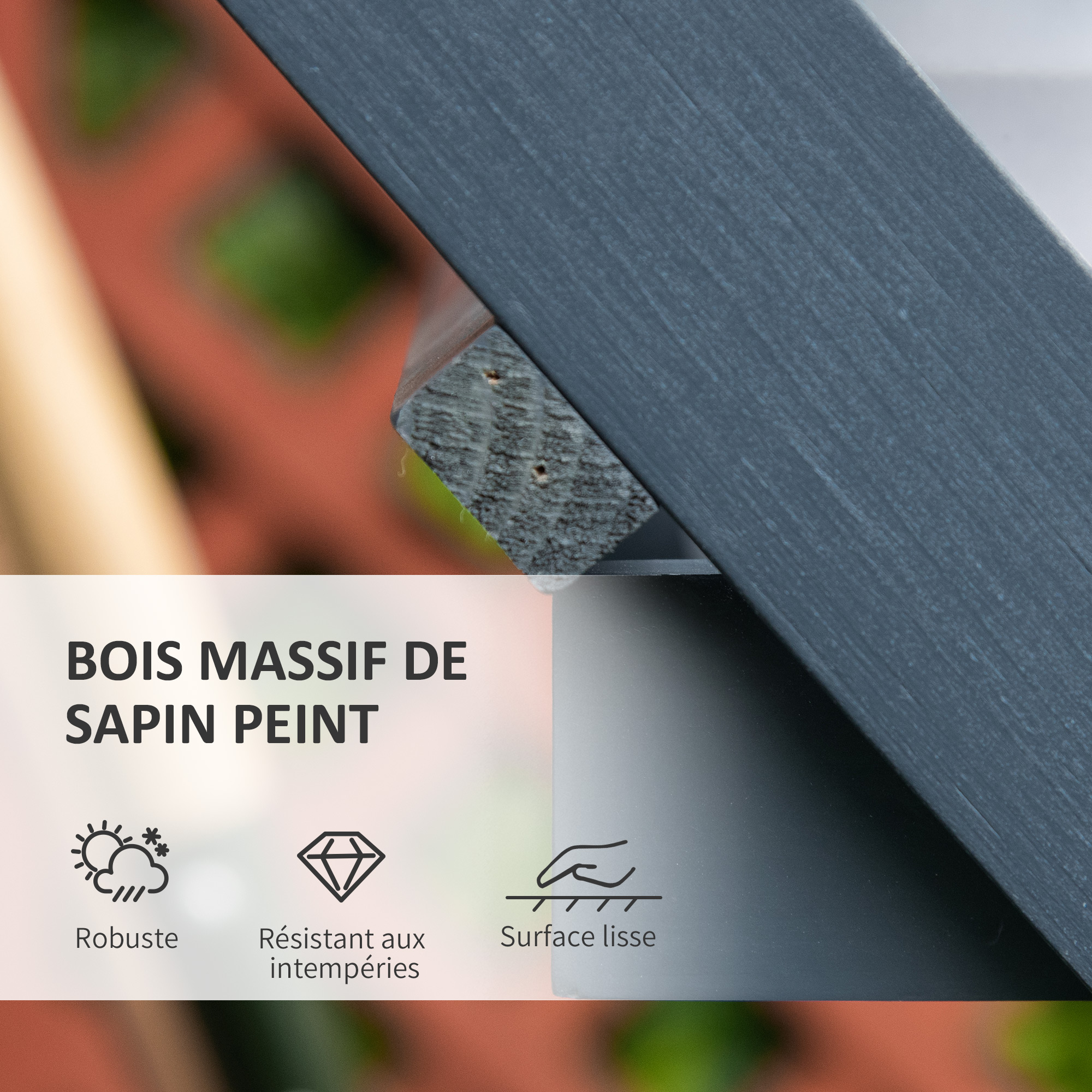 - Matériau principal : bois de sapin traité, peint