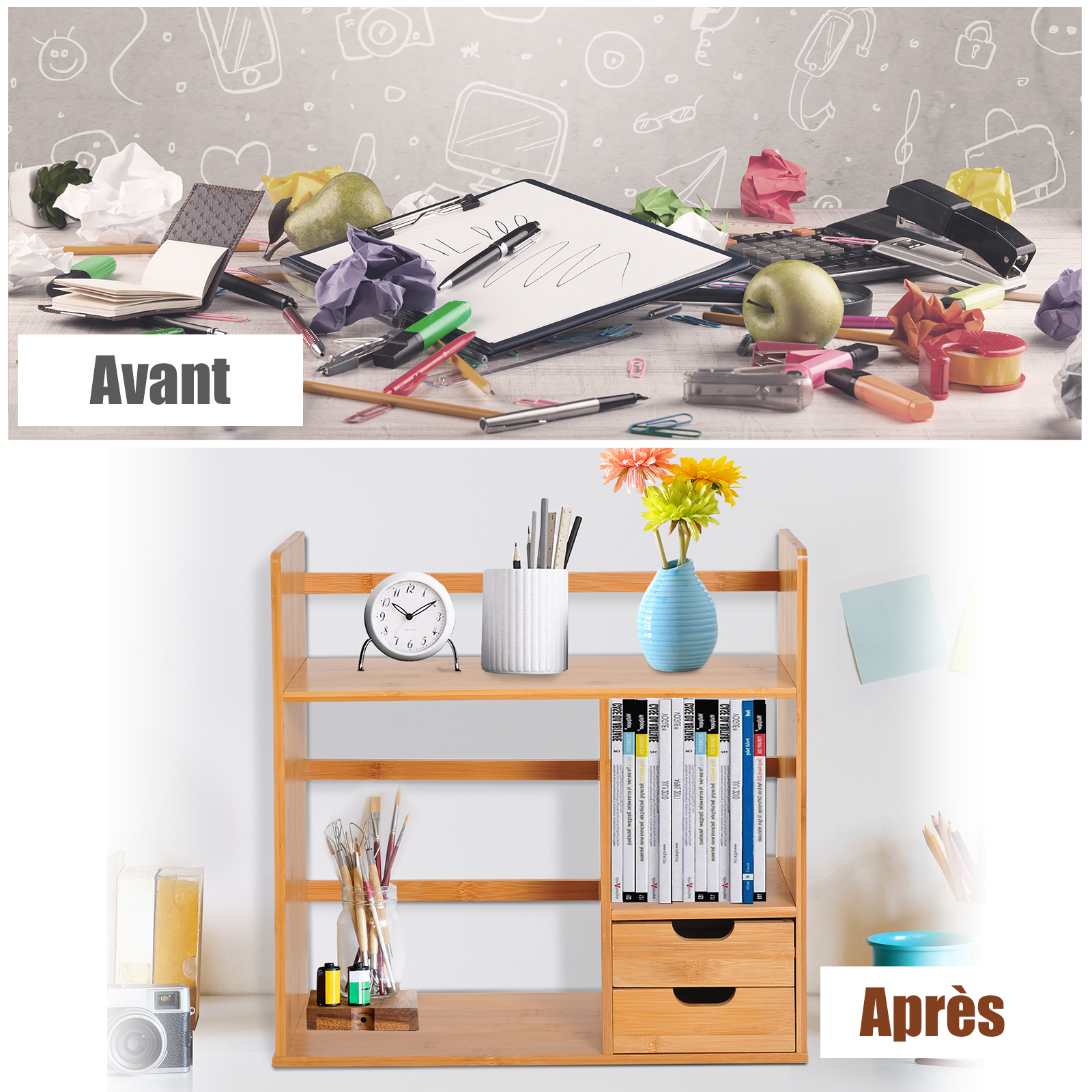 - Comme tous les produits en bambou, ce organisateur de bureau diffuse une certaine chaleur, faites un peu d'ordre sur votre espace de travail et faites de votre bureau un endroit agréable