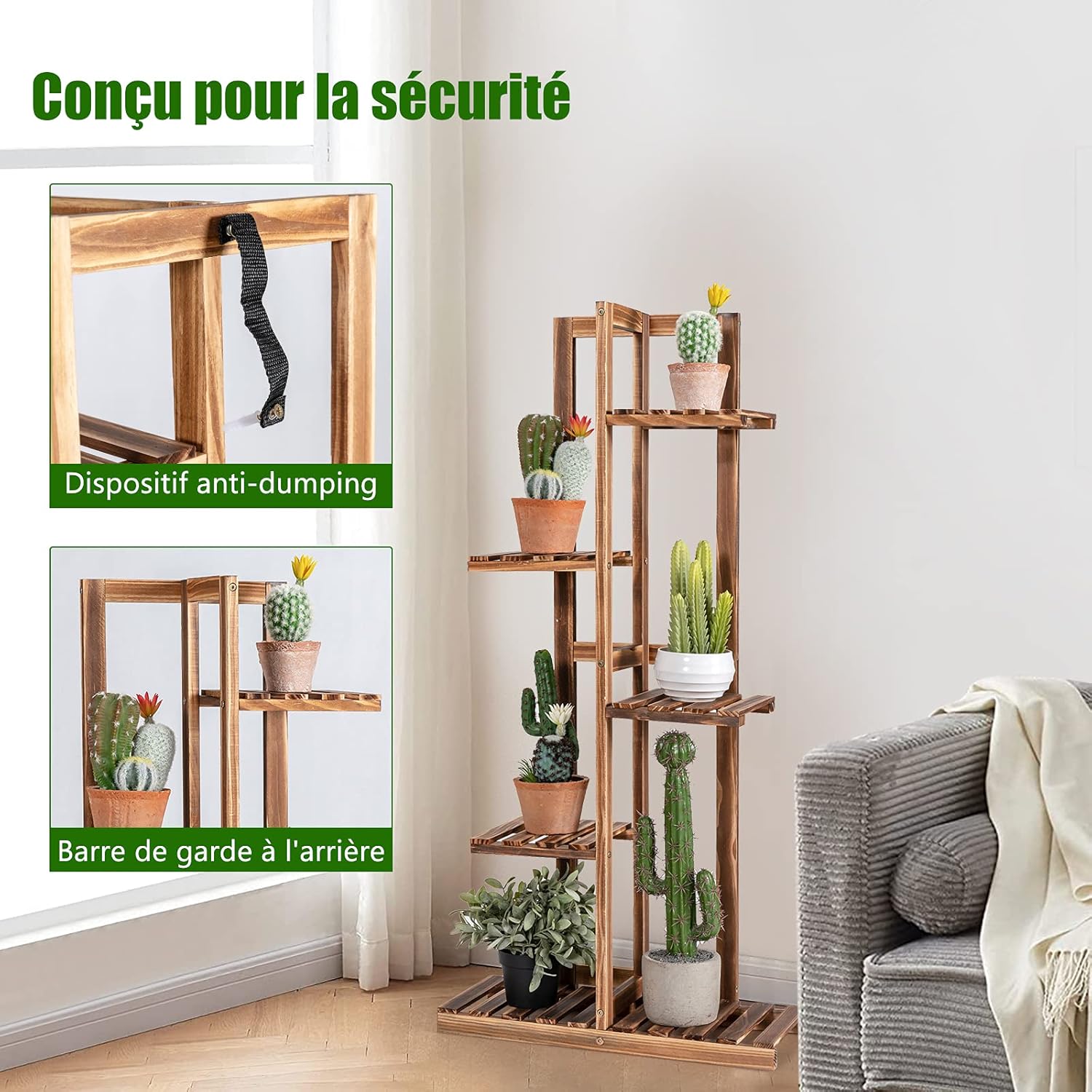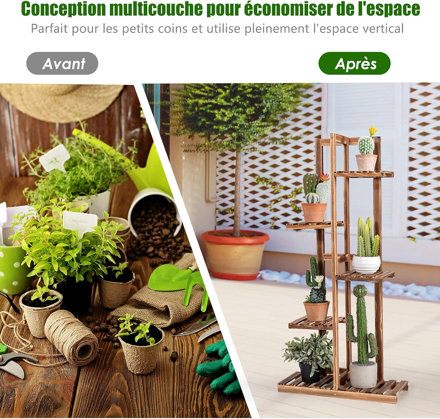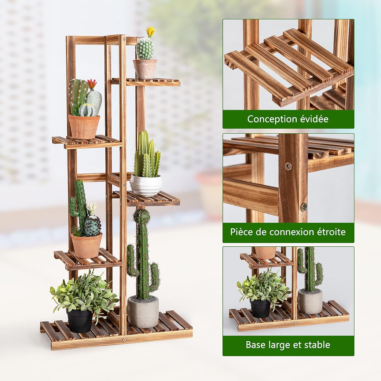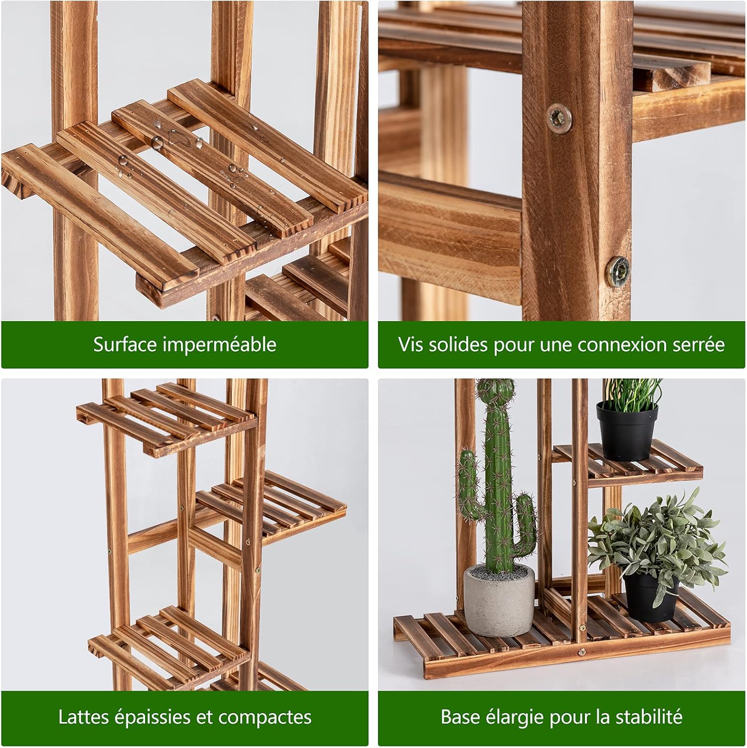- Cadre en bois soigneusement sélectionné : Fabriqué en bois de pin de première qualité, le présentoir pour plantes est assez solide et résistant pour une utilisation à long terme. De plus, il a été traité par carbonisation à haute température, ce qui le rend difficile à déformer ou à fendre. La surface soigneusement finie est conçue pour prévenir des blessures.