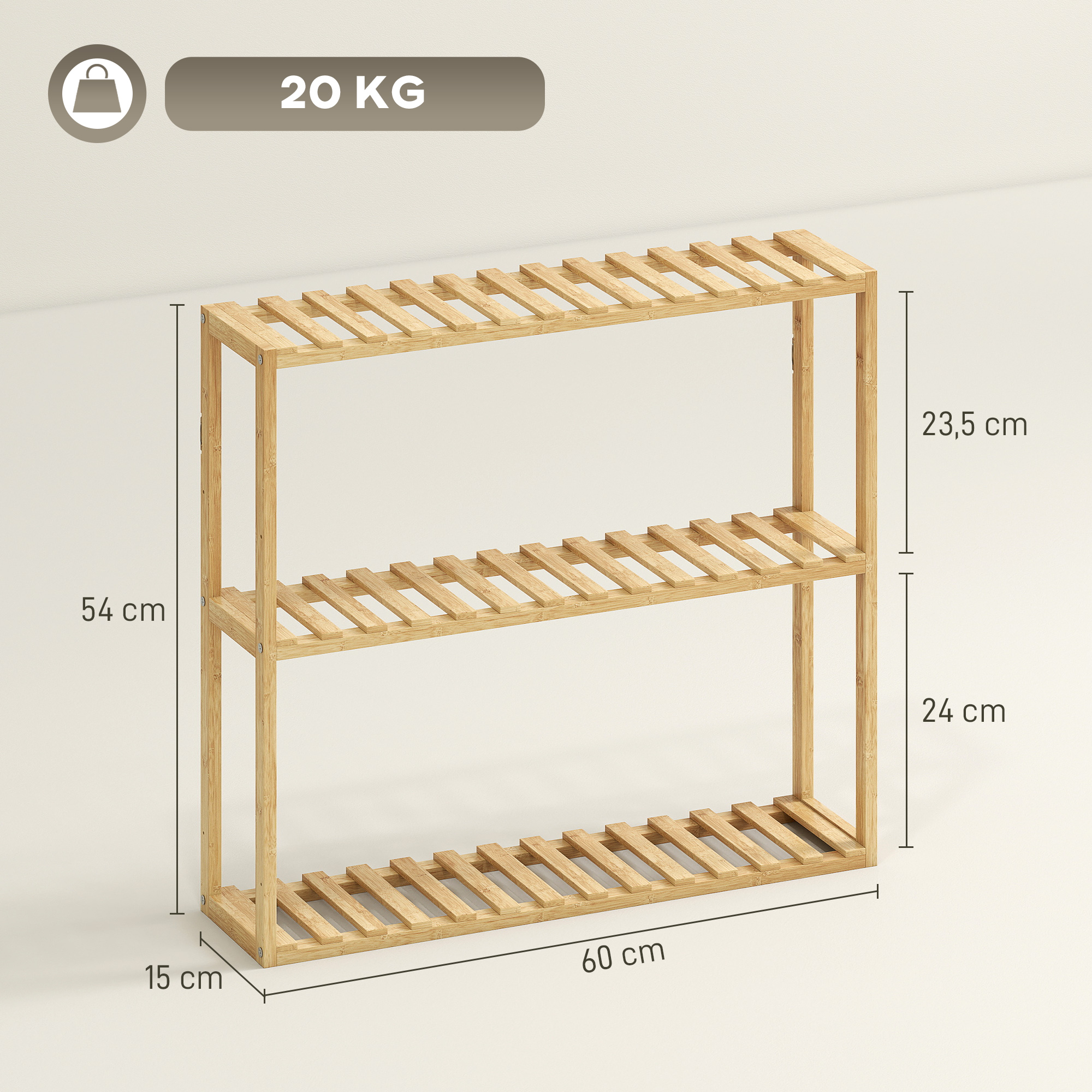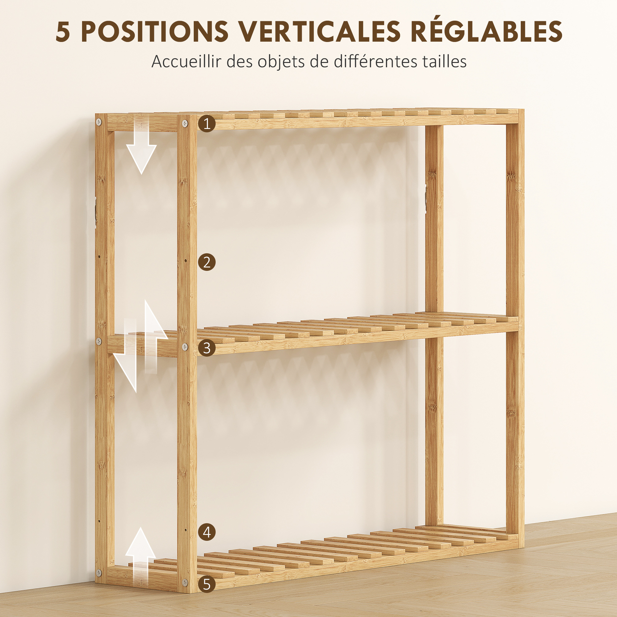 Optimisez l'espace avec l'étagère en bambou de HOMCOM. Trois niveaux réglables, cinq hauteurs, montage au sol ou mural inclus. Montage simple, résistante à l'humidité, parfaite pour salles de bains, cuisines, chambres.