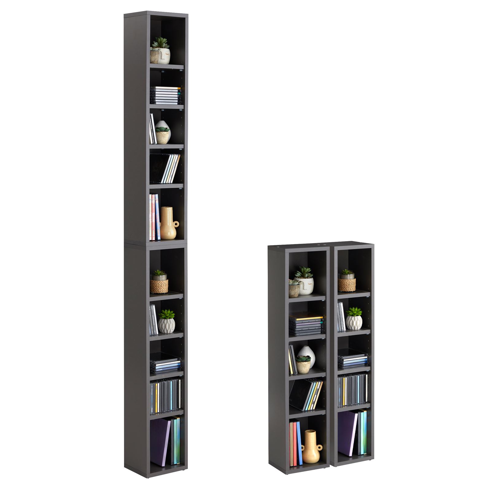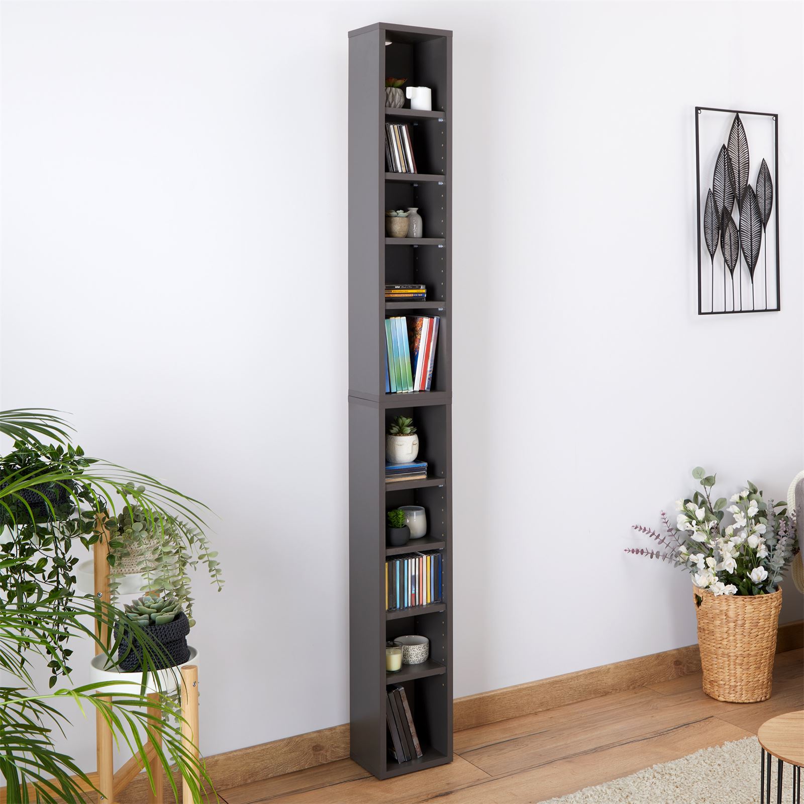 ... se compose de 2 colonnes que vous pouvez disposer l'une à côté de l'autre ou bien l'une sur l'autre en toute sécurité grâce au kit de fixation inclus. Grâce à son design étroit et peu encombrant, cette bibliothèque trouvera facilement sa place dans votre intérieur selon l'espace disponible. De plus, les tablettes sont réglables en hauteur, vous permettant ainsi de ranger tous vos CD, DVD ou disques BLU-RAY selon vos besoins.
