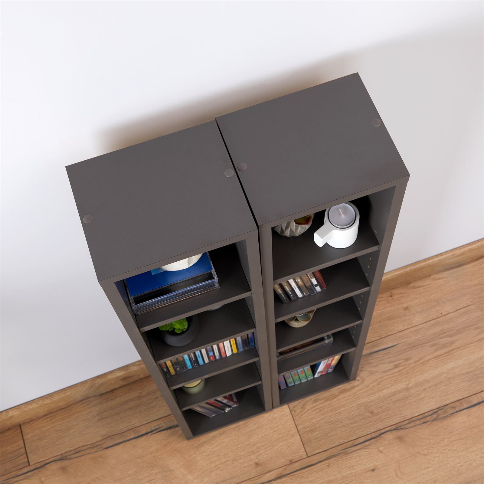 | Libellé | Etagères modulables MUSIQUE pour CD et DVD, lot de 2 meubles de rangement en colonne avec 10 compartiments, en mélaminé gris mat |