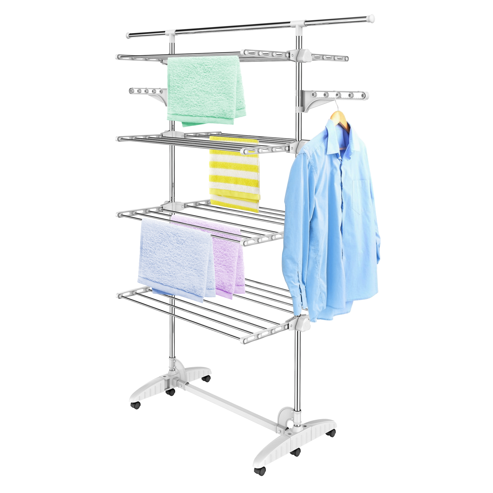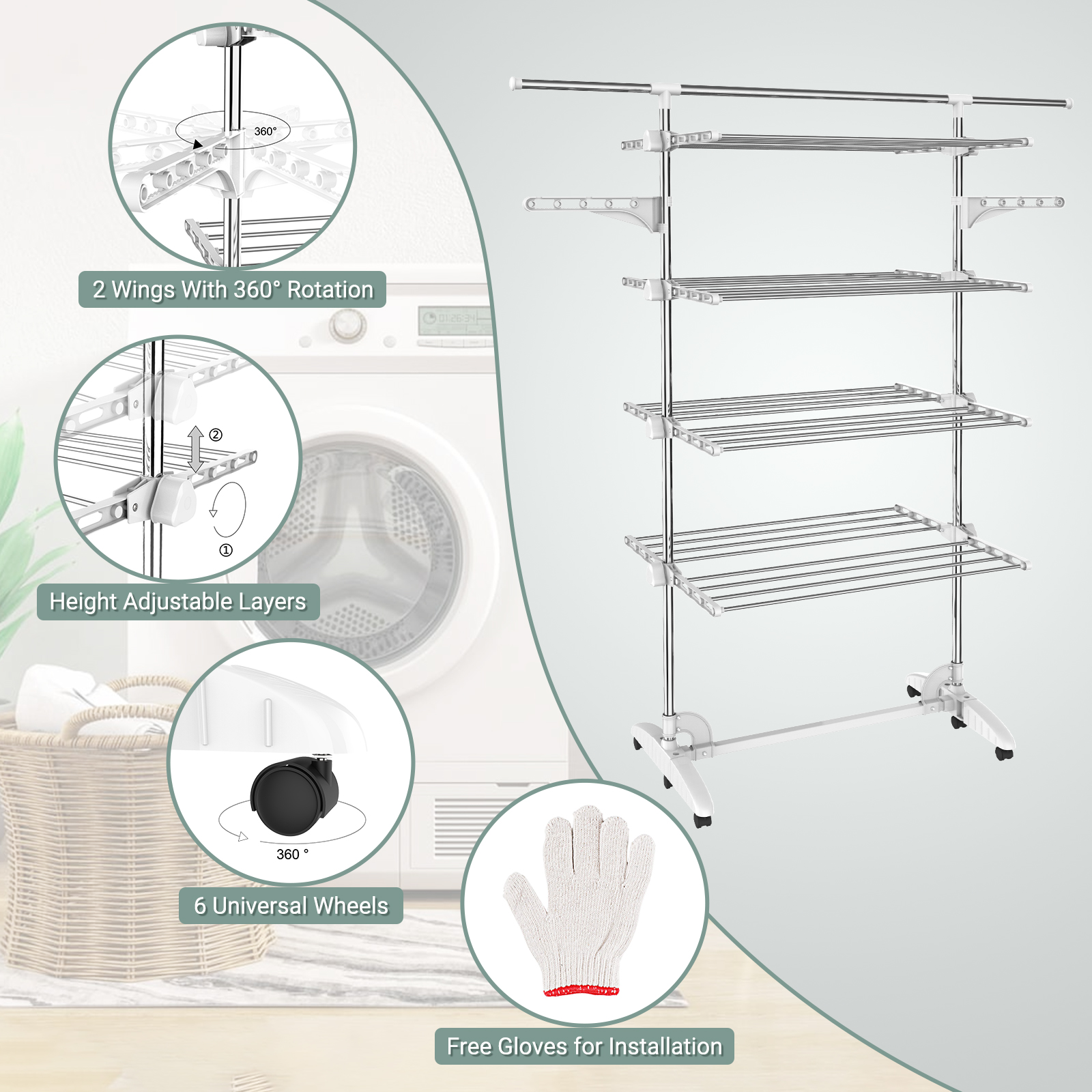 | Libellé | Etendoir à Linge, Etendage à Linge, 4 étagères, Blanc, Avec des ailes et une barre supérieure étendue, Matériau: Tubes en acier inoxydable |