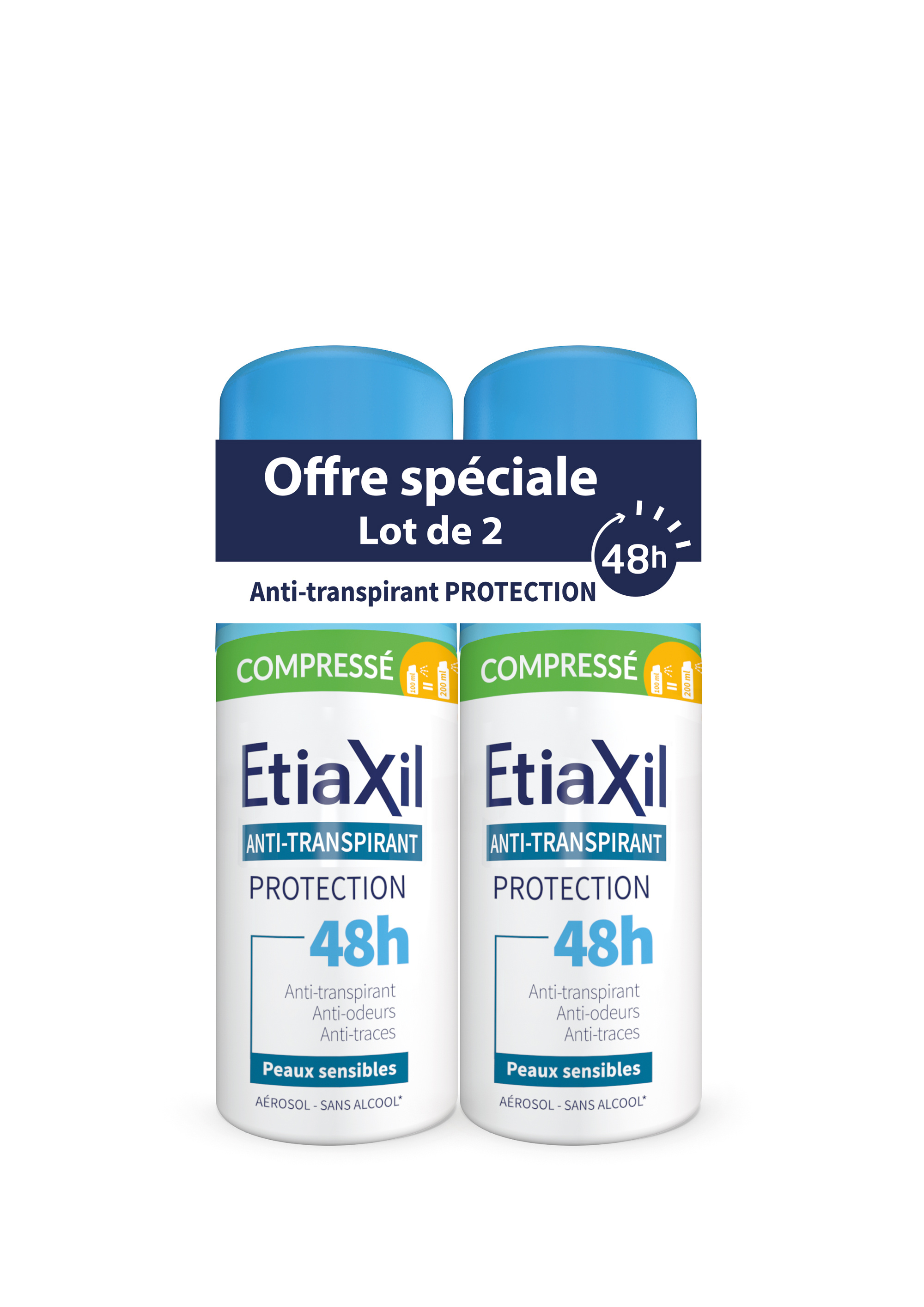 Etiaxil Anti-Transpirant Protection 48H Peaux Sensibles Aérosol Compressé Lot de 2 x 100 ml est un aérosol anti-transpirant pour peaux sensibles à la formule enrichie en actifs déodorants et anti-transpirants. Il assure une efficacité de 48 heures contre les mauvaises odeurs et l'humidité.