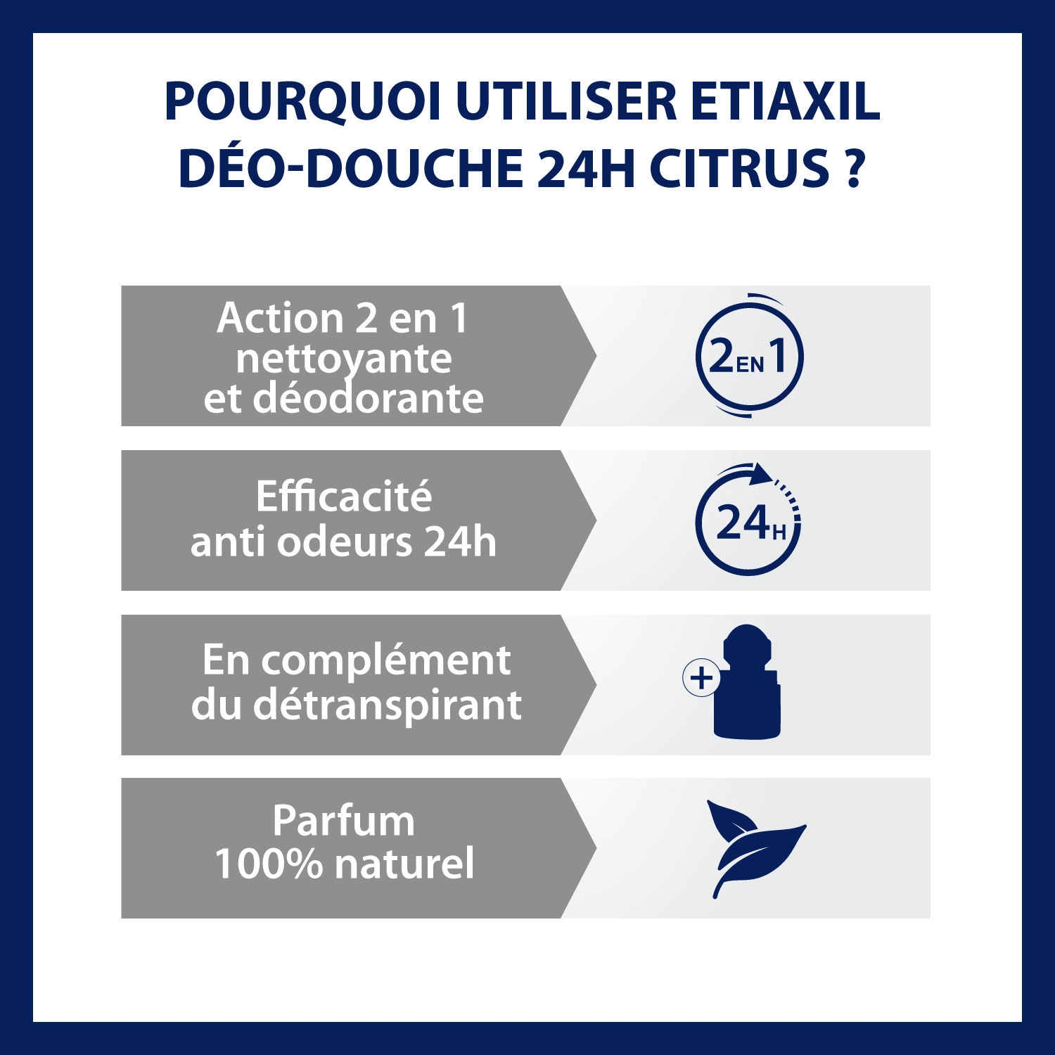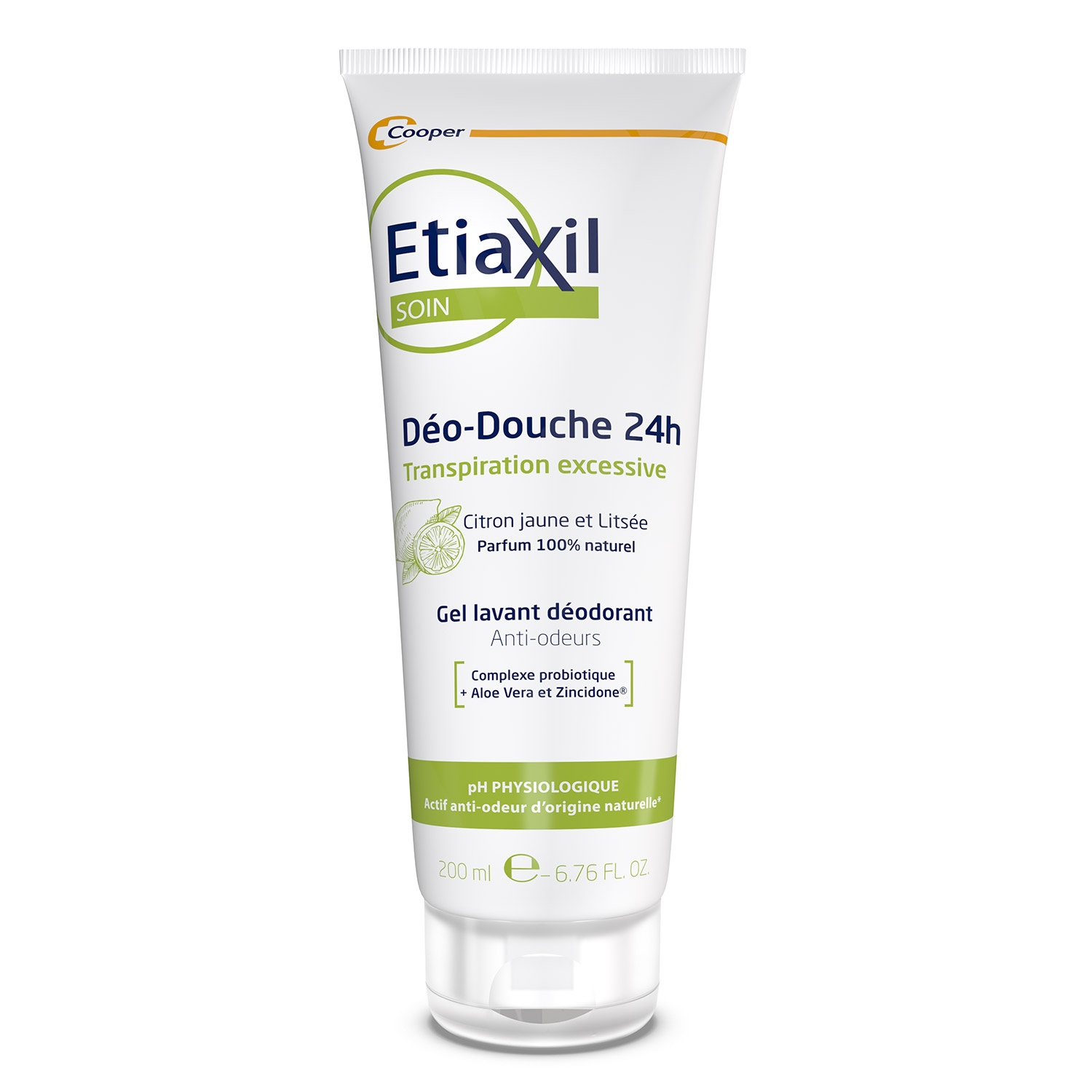Etiaxil Déo-douche Citrus 24h est une formule 2-en-1 nettoyante et déodorante pour lutter contre la transpiration excessive. 95% des testeurs de ce produit ont été satisfaits. Ce gel douche nettoie la peau grâce à des agents doux, son action déodorante neutralise et empêche la formation des mauvaises odeurs à l’aide du sel de Zinc (Zincidone®). Son complexe probiotique contribue à l’équilibre de la flore cutanée, tout en hydratant la peau grâce aux propriétés de l’aloe vera. Son parfum 100% d'origine naturelle à base d'huiles essentielles de citron jaune et de litsée procure une sensation de fraîcheur toute la journée. Etiaxil Déo-Douche Citrus 24h a été testé sous contrôle dermatologique, et est formulé au pH physiologique pour respecter la peau.