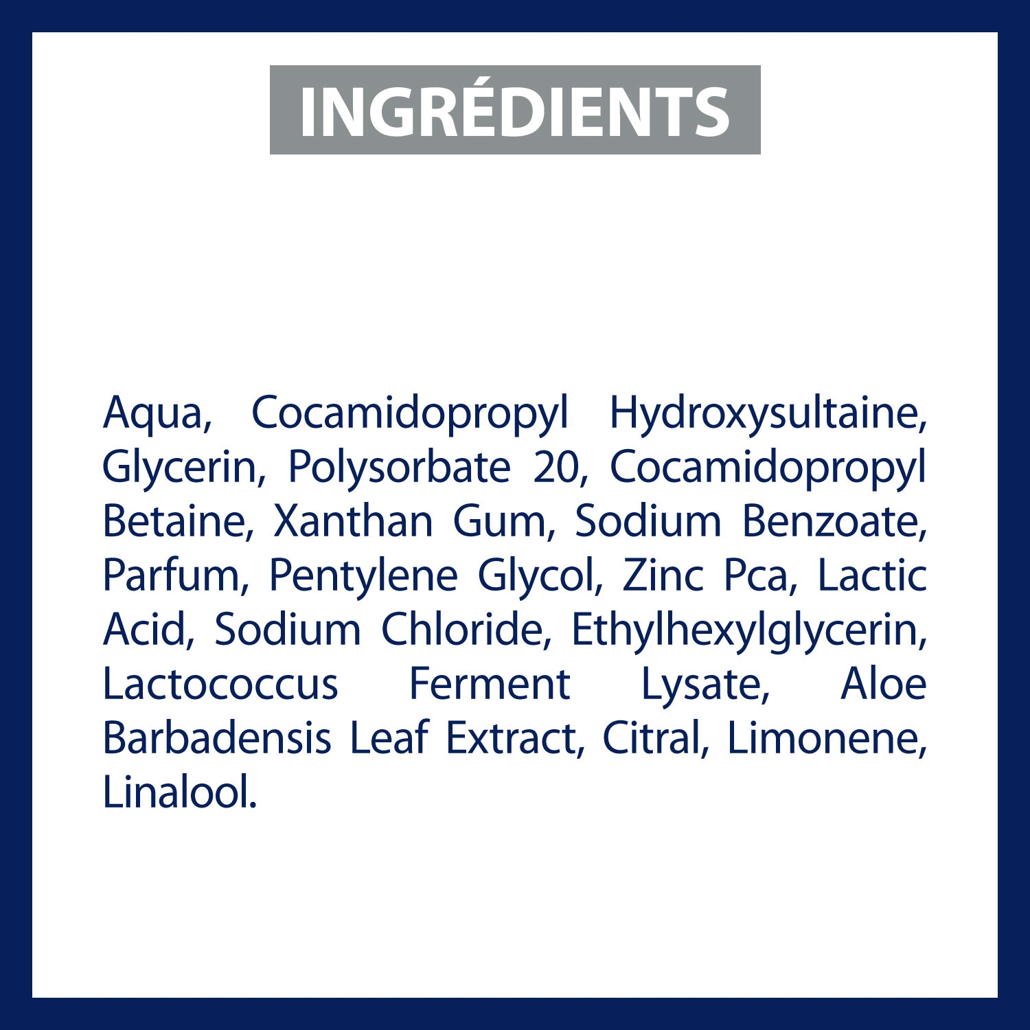 Ingrédients : Aqua, Cocamidopropyl Hydroxysultaine, Glycerin, Polysorbate 20, Cocamidopropyl Betaine, Xanthan Gum, Sodium Benzoate, Parfum, Pentylene Glycol, Zinc Pca, Lactic Acid, Sodium Chloride, Ethylhexylglycerin, Lactococcus Ferment Lysate, Aloe Barbadensis Leaf Extract, Citral, Limonene, Linalool.