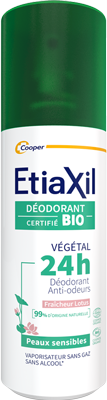 Le spray sans gaz Etiaxil Déodorant Végétal 24h est formulé avec 95% d’ingrédients d’origine naturelle, et a été testé sous contrôle dermatologique1 pour convenir aux peaux les plus sensibles. Ce produit neutralise les odeurs grâce au Tea tree qui limite la prolifération des bactéries, absorbe l'humidité grâce à l'argile blanche et apaise la peau avec l'aloe vera. Ses actifs déodorants d’origine naturelle assurent une action anti-odeurs pendant 24 heures, sans bloquer le débit de la transpiration. C’est pourquoi ce déodorant convient aux personnes ayant une transpiration faible mais odorante. Sa formule haute tolérance est aussi anti-traces1 et prévient la formation de traces blanches et jaunes.
