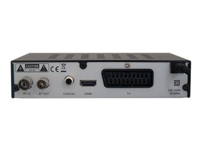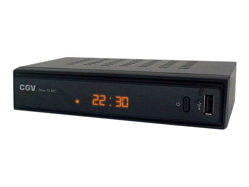 CGV Etimo T2 REC. Source du signal: Satellite, Type HD: Full HD, Format du système de signal numérique: DVB-T2. Format vidéo pris en charge: AVI, MKV, MP4, MPEG1, MPEG2, MPG, TS, VOB, Formats audio pris en charge: FLAC, MP3, OGG, WAV, WMA, Formats d'image supportés: BMP, JPG. Couleur du produit: Noir, Type de tuner: Numérique, Nombre de tuners: 1 tuner(s). Consommation électrique typique: 6 W, Consommation d'énergie (mode veille): 1 W. Largeur: 168 mm, Profondeur: 105 mm, Hauteur: 35 mm