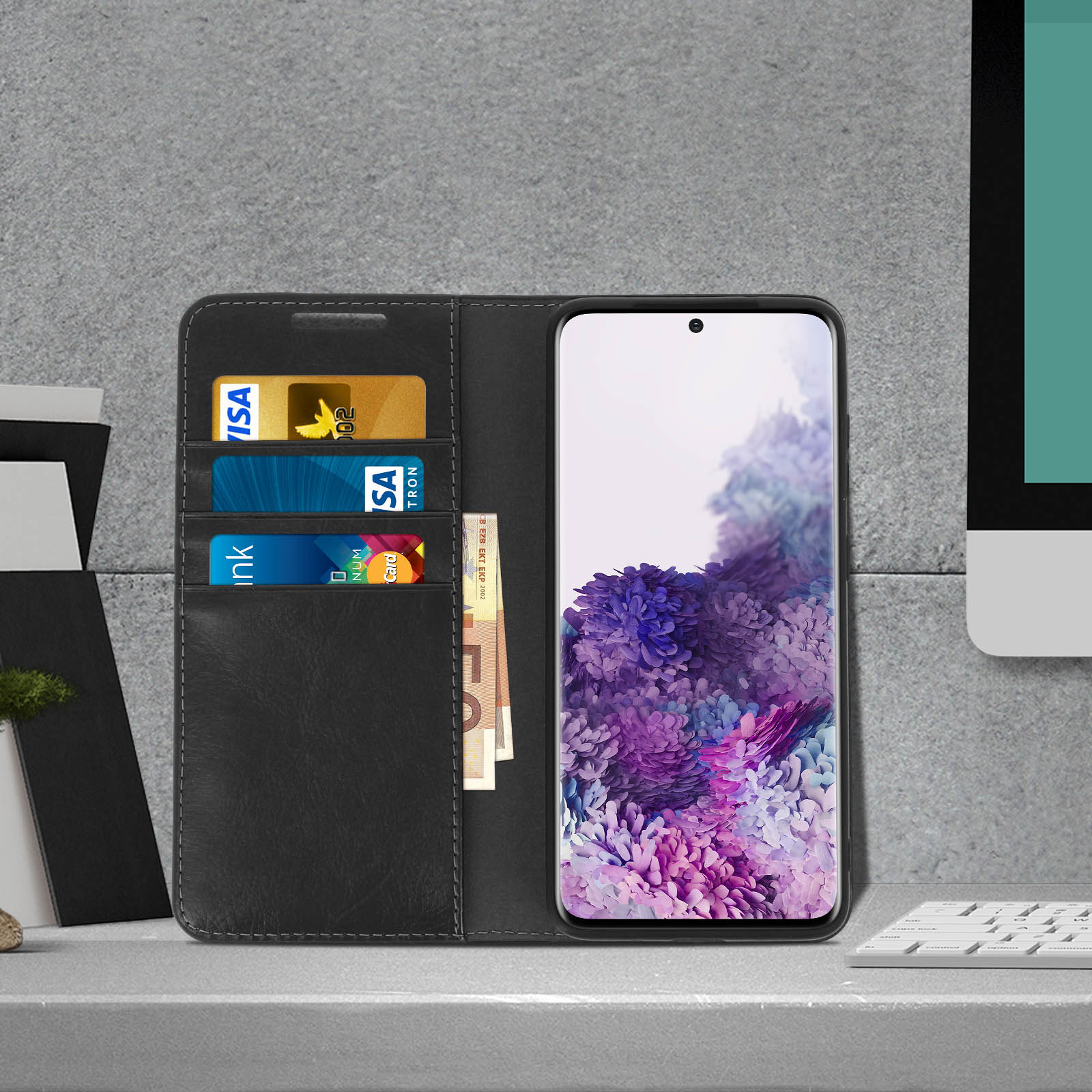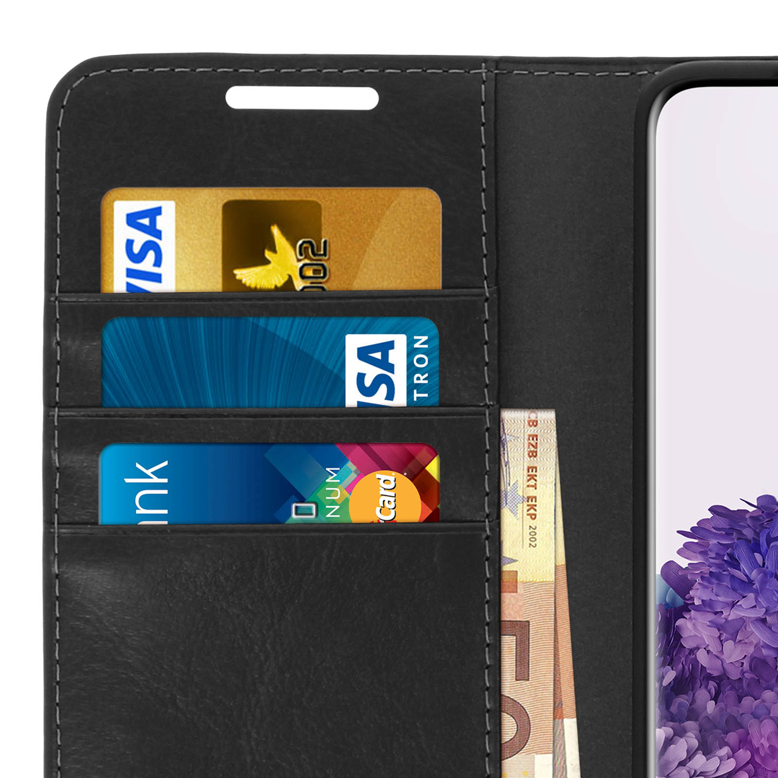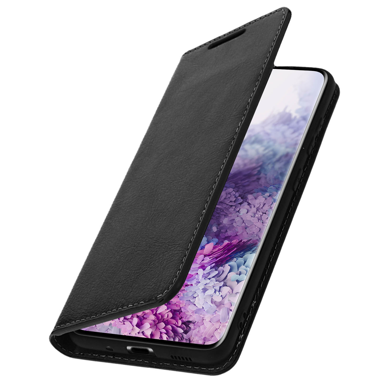 Étui folio en cuir véritable pour Samsung Galaxy S20 Ultra. Résistant aux chocs et rayures. Intègre trois porte-cartes et une pochette latérale pour billets de banque. Fonction support vidéo. Coque de maintien en silicone gel. Fonctions accessibles.
