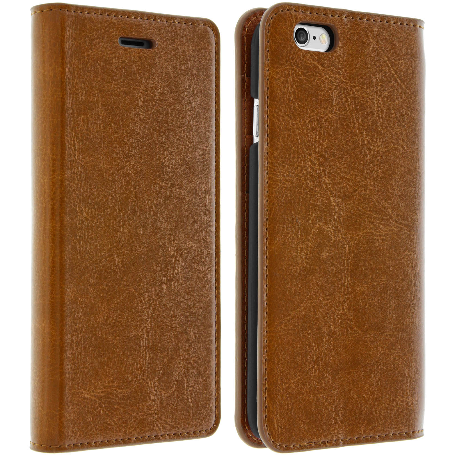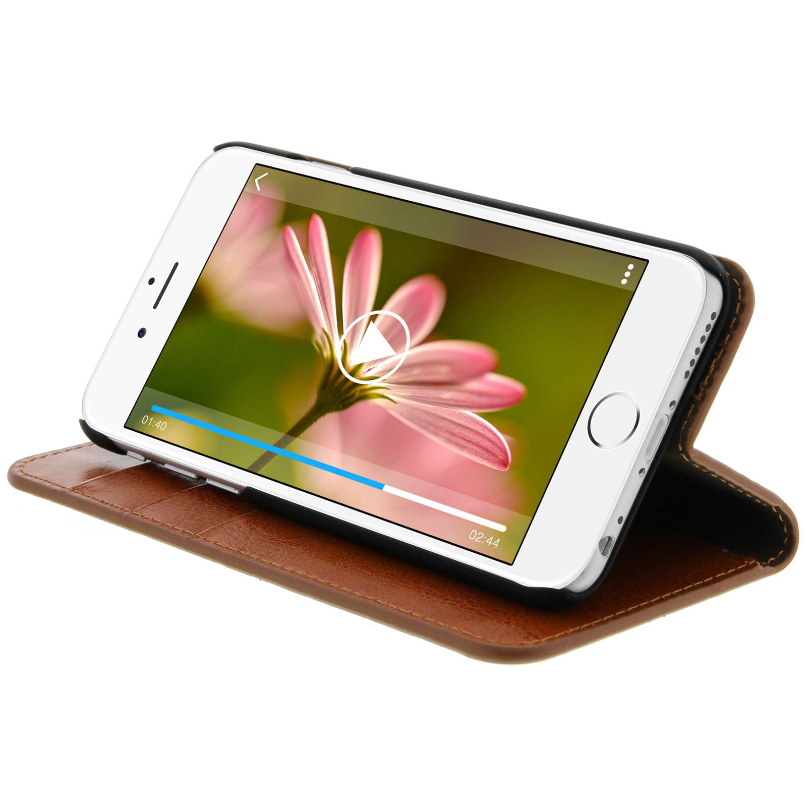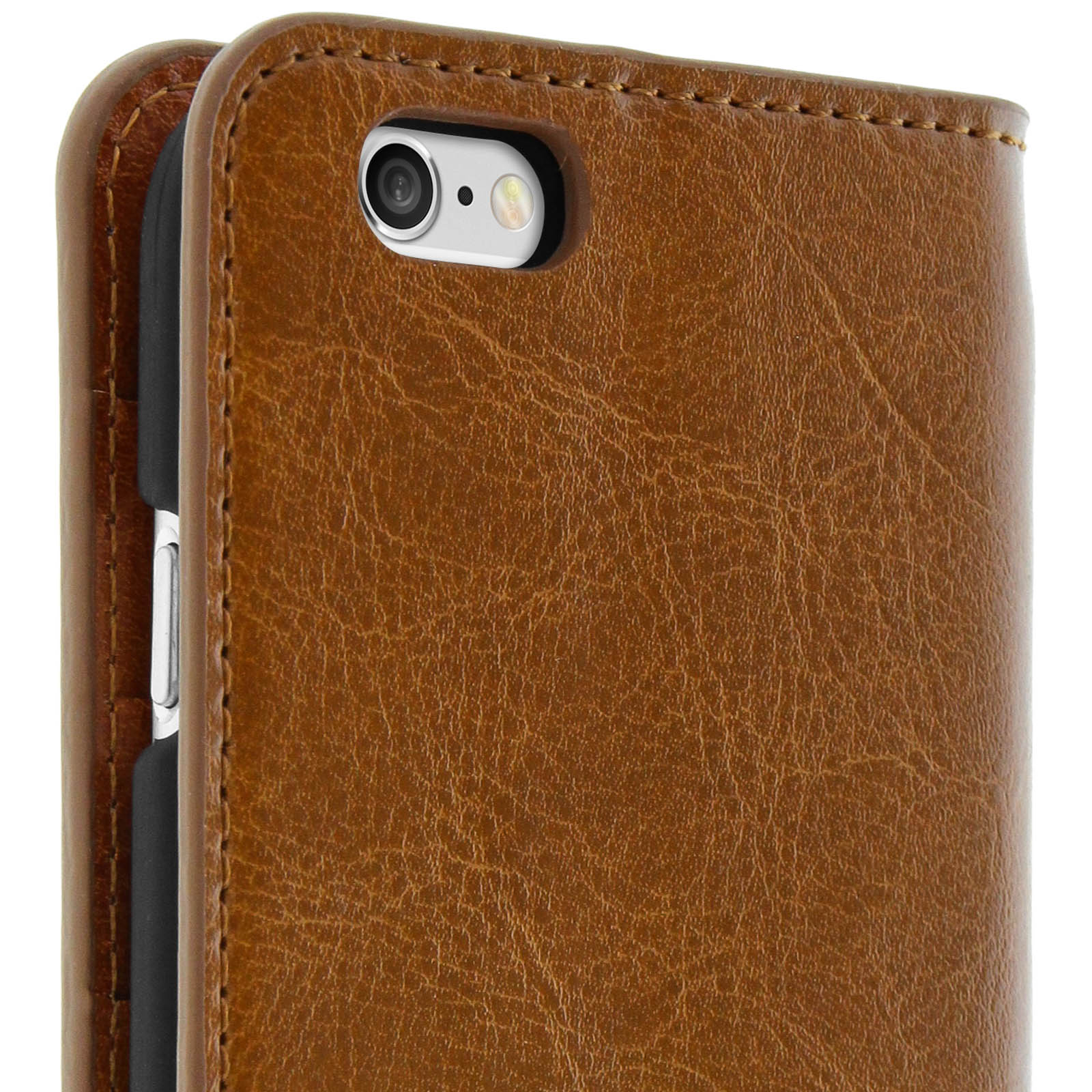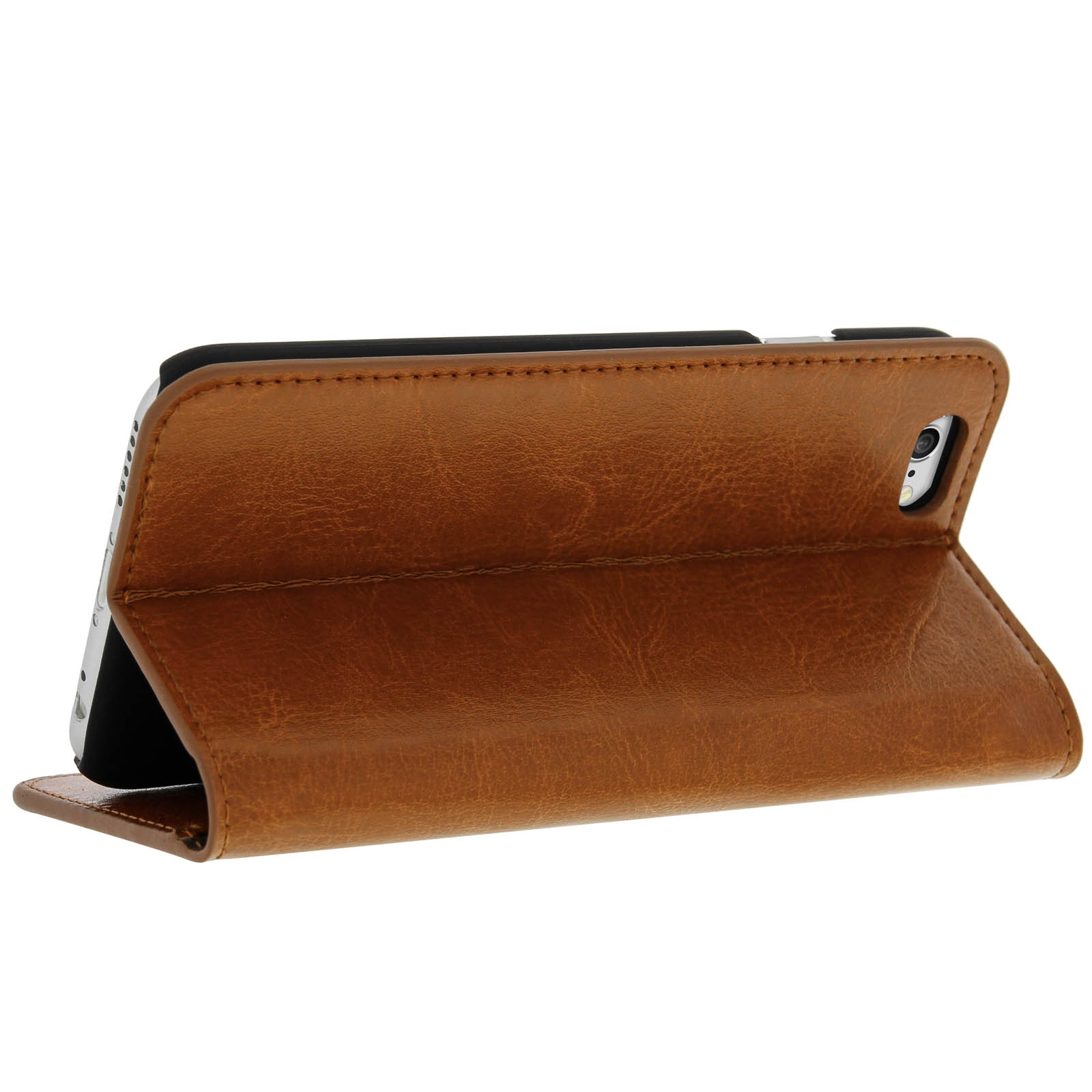 Housse à clapet portefeuille en cuir graine, fonction support pour Apple iPhone 6 et 6s. Revêtement en cuir véritable surpique et coque de maintien rigide sur-mesure. Compartiments pour cartes et poche latérale. Toutes les fonctions sont accessibles.