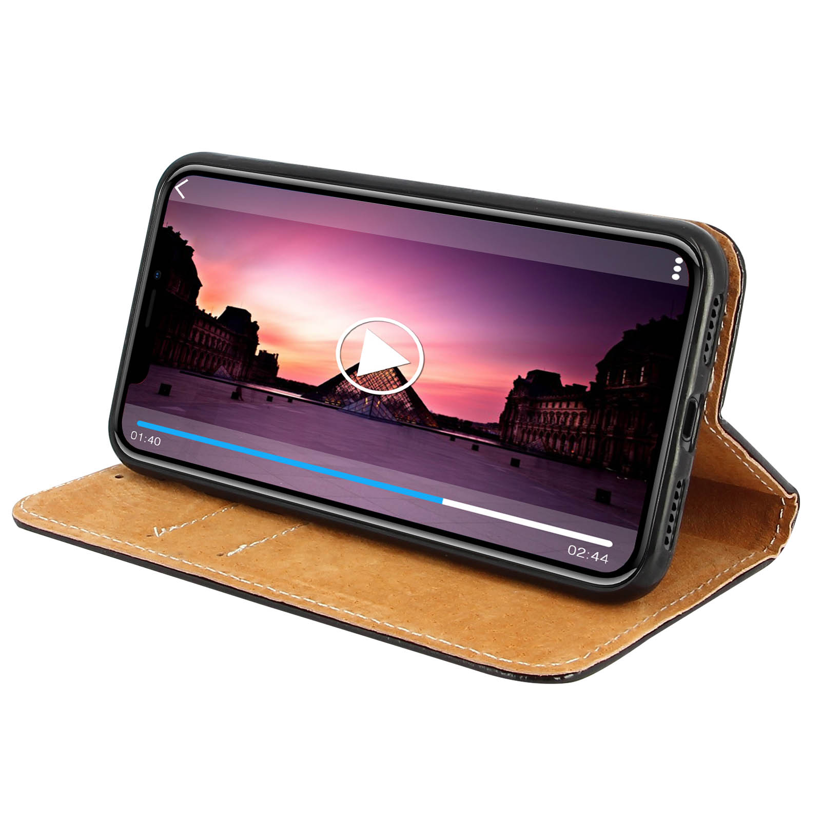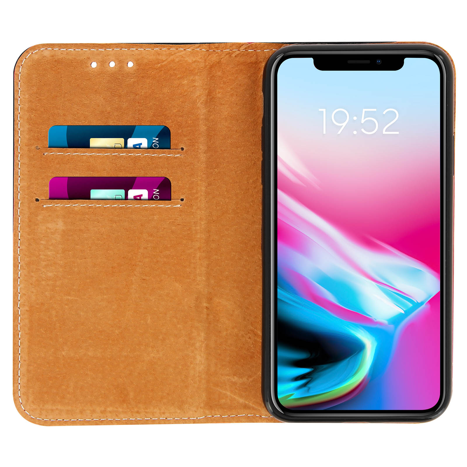 Housse Apple iPhone X / XS. Revêtement éco-cuir + intérieur cuir véritable avec finitions surpiquées. 2 porte-cartes et pochette latérale pour billets de banque. Fonction support vidéo. Languette magnétique. Fonctions accessibles.