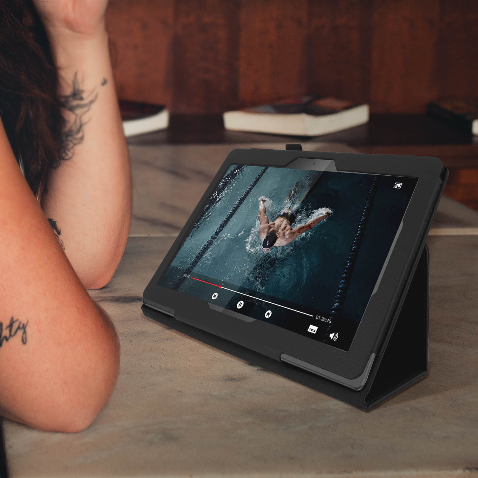 Housse Lenovo Tab E10 10.1. Protection intégrale. Revêtement en éco-cuir effet texturé + intérieur soft touch. Design moderne et élégant. Fermeture magnétique. Rabat pliable fonction support vidéo. Fonctions accessibles. Emplacement stylet dédié.