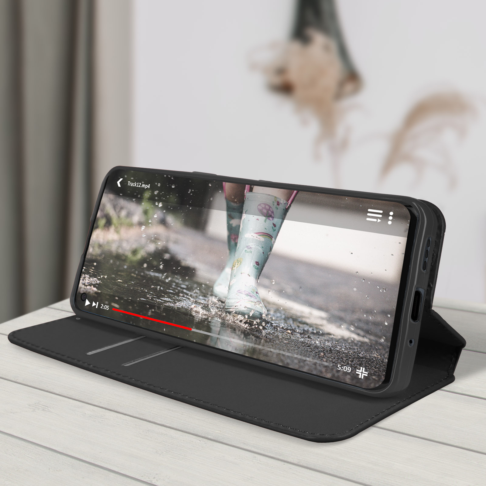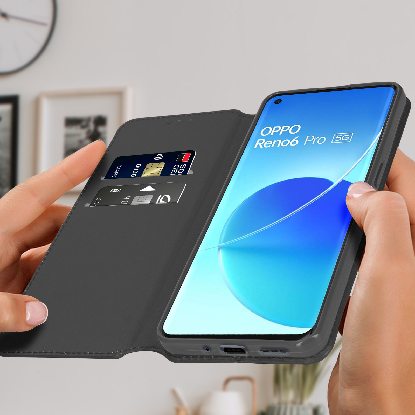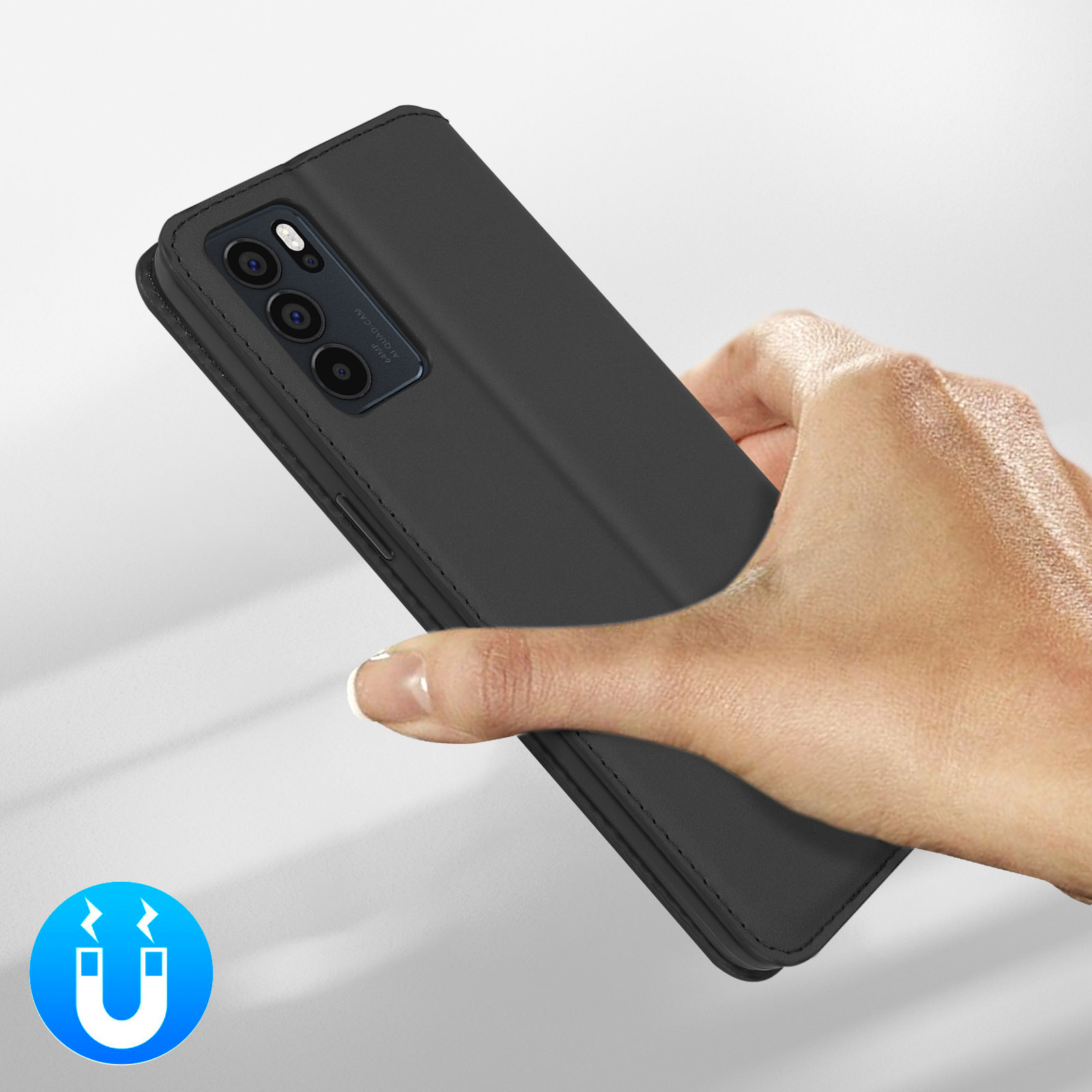 Étui folio avec clapet aimanté pour Oppo Reno 6 Pro 5G. Protection intégrale contre les chocs et rayures. Fonction support pour visualiser le contenu multimédia. Compartiments pour cartes intégrés dans le clapet. Fonctions accessibles.