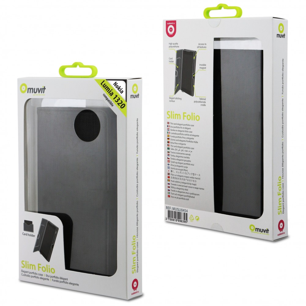 Etui pour Nokia Lumia 1320 noir de marque Muvit. - Matière : PU - Possibilité de ranger 2 cartes - Fonction de support - Fermeture par un clip aimanté - Accès aux connectiques.