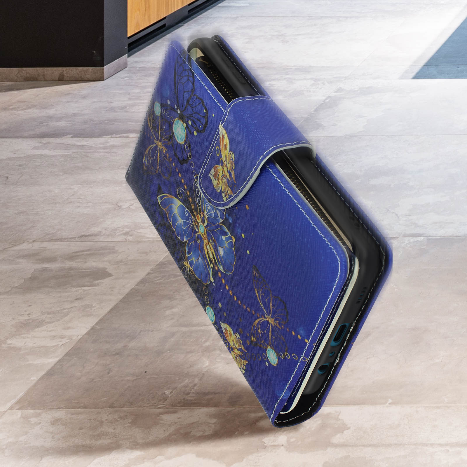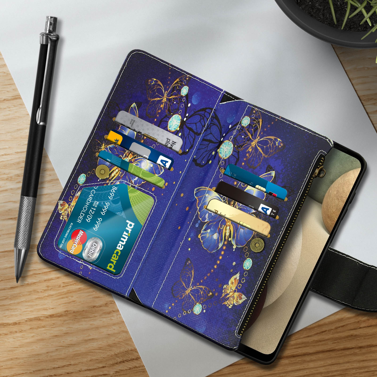 Étui Samsung Galaxy A12 Clapet Multicompartiments et Support Vidéo Papillons Or