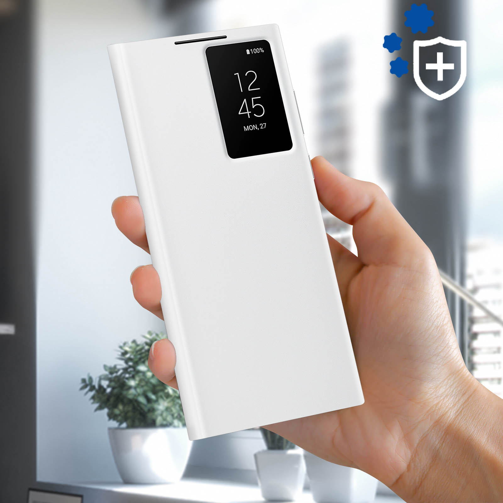 Étui d'Origine Samsung Galaxy S22 Ultra, Smart Clear View Cover. Disposant d'une ouverture d'affichage sur le clapet. Coque de maintien rigide. Protection intégrale. Revêtement antibactérien. Fonctions accessibles. Compatible recharge sans fil.