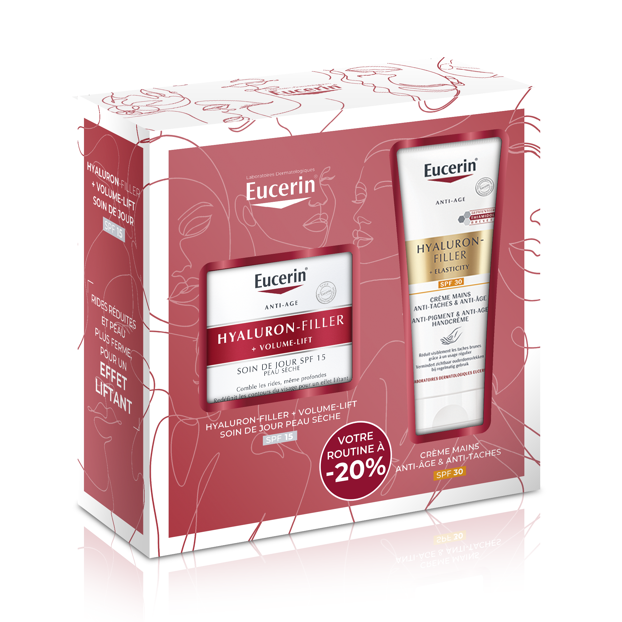 Le Coffret Eucerin Anti-Âge Kit Routine Volume Lift Peau Sèche offre une solution complète pour lutter contre les signes de l'âge et redonner du volume à la peau. Il comprend : 1. Crème Jour Hyaluron Filler Volume Lift SPF15 (50 ml): Avec l’âge, la peau perd de son volume et de sa fermeté. Les contours du visage se relâchent et les traits du visage changent visiblement. Hyaluron-Filler + Volume-Lift d'Eucerin combine 3 ingrédients actifs pour cibler spécifiquement les différentes couches de l’épiderme : 1. Le Magnolol stimule efficacement le développement des cellules à l’origine du volume de la peau, en augmentant leur nombre et leur taille.* 2. Les Oligo Peptides stimulent le réseau des fibres de collagène responsable de la structure ferme de la peau.* 3. La formule, qui contient de l’Acide Hyaluronique, hydrate intensément la peau et comble les rides, même profondes. La protection anti-UVB (SPF 15) et anti-UVA protège efficacement des signes de vieillissement cutané prématuré et de l’accentuation des rides provoqués par les UV. Résultats : Les contours du visage apparaissent plus fermes et les rides réduites, pour un effet liftant. Avec son parfum agréable, la formule de soin intense procure une sensation de douceur à la peau. Des études cliniques et dermatologiques le prouvent : bonnes tolérance cutanée et efficacité 2. Crème Mains Anti-Taches & Anti-Âge HYALURON-FILLER + ELASTICITY (75 ml): Cette crème possède une formule unique qui offre de multiples bienfaits anti-âge. Elle contient de l’Acide Hyaluronique de haut et bas poids moléculaire, qui hydrate la peau et stimule la production d’Acide Hyaluronique, ainsi que de l'Arctiine, un actif reconnu pour accélérer le renouvellement du collagène dans les cellules de la peau. Elle contient également du Thiamidol*, un ingrédient efficace et breveté qui agit à la racine de l'hyperpigmentation en réduisant la production de mélanine. Il est cliniquement et dermatologiquement prouvé qu'il réduit les taches brunes et prévient leur réapparition. Les premiers résultats sont visibles après 2 semaines** et s'améliorent continuellement avec une utilisation régulière. La protection SPF 30 offre une protection efficace contre le soleil et prévient la formation de futures taches brunes et le vieillissement cutané induit par le soleil. Les taches de vieillesse sur les mains sont visiblement réduites, et la peau paraît uniforme et éclatante. Ce coffret assure une routine de soin efficace pour une peau visiblement plus jeune et des mains revitalisées. Résultats visibles dès deux semaines. *Test in vitro *Thiamidol breveté (EP 2 758 381 B1) FR, BE, NL.
