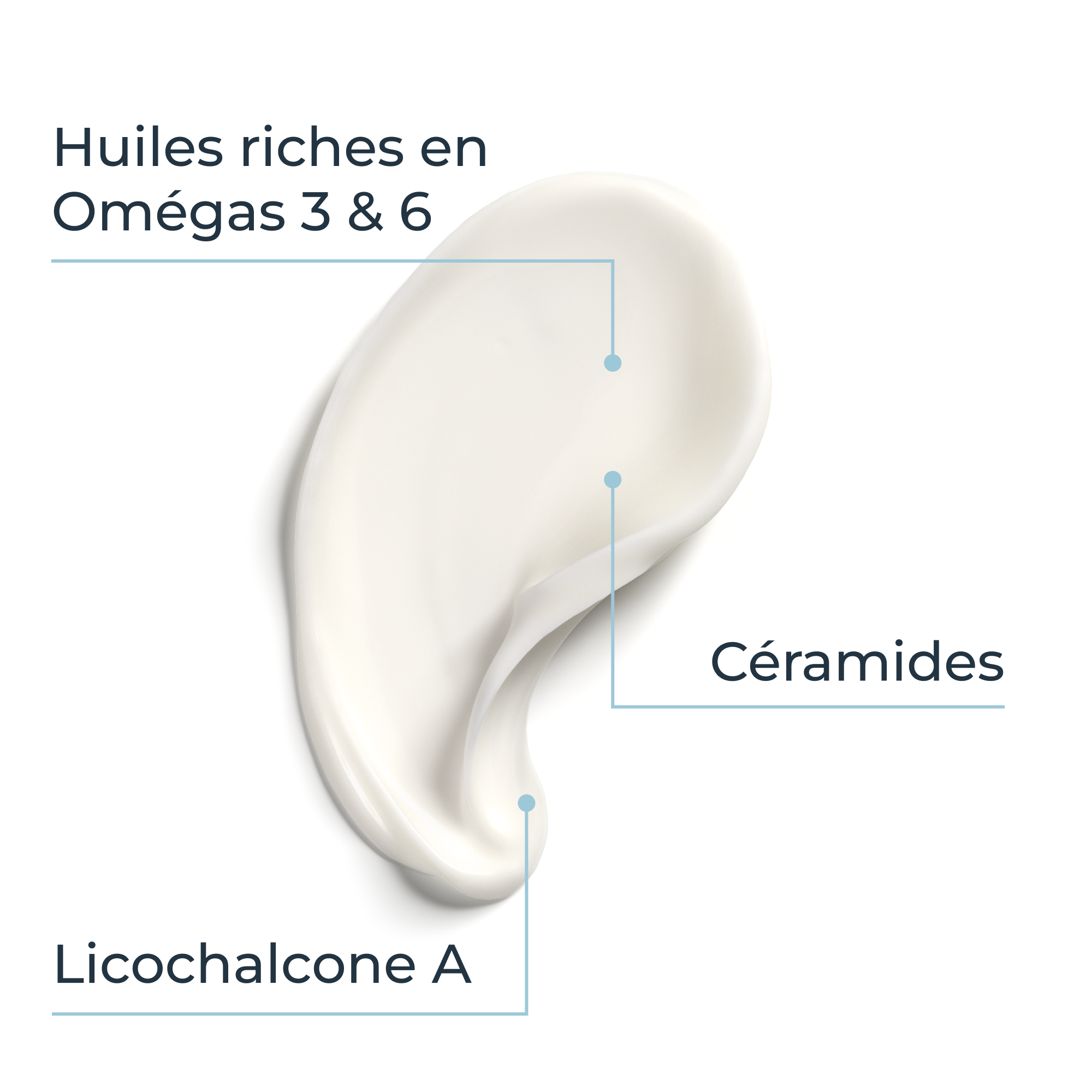 Ingrédients : Aqua, Glycerin, Butyrospermum Parkii Butter, Octyldodecanol, Caprylic/Capric Triglyceride, Vitis Vinifera Seed Oil, Distarch Phosphate, Glyceryl Stearate Se, Cetearyl Alcohol, Hydroxypropyl Starch Phosphate, Oenothera Biennis Oil, Glycyrrhiza Inflata Root Extract, Ceramide Np, Phytosphingosine, Sodium Pca, Glycine, Decylene Glycol, Tocopherol, Citric Acid, Sodium Citrate, Helianthus Annuus Seed Oil, Behenyl Alcohol, Polyglyceryl-3 Methylglucose Distearate, Ethylhexyl Glycerin, Hydroxyacetophenone, Trisodium Ethylenediamine Disuccinate, Sodium Cetearyl Sulfate, Xanthan Gum, Ascorbyl Palmitate, Oleic Acid, Phenoxyethanol.