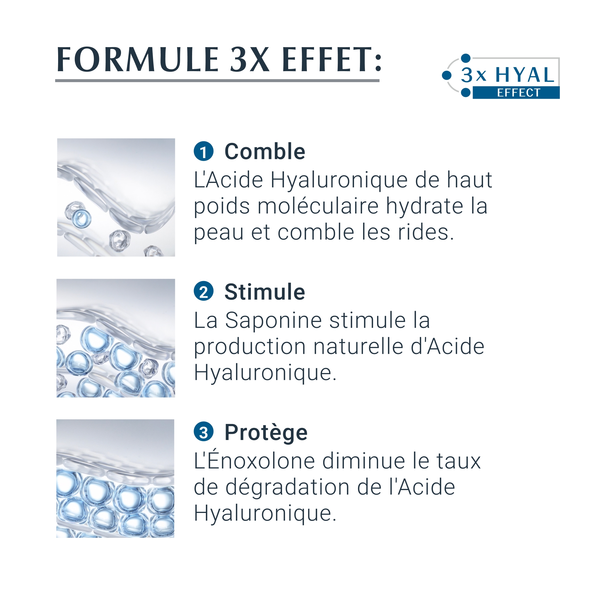 cutané grâce au [HYAL] COMPLEX : 1 - COMBLE : L'Acide Hyaluronique de haut et bas poids moléculaire hydrate la peau et comble les rides. 2 - STIMULE : La Saponine stimule la production naturelle d'Acide Hyaluronique. 3 - PROTÈGE : L'Enoxolone diminue le taux de dégradation de l'Acide Hyaluronique. La protection anti-UVB (SPF 15) + anti-UVA + la Saponine anti-oxydante aident à prévenir efficacement le vieillissement cutané et l'accentuation des rides induits par le soleil, et protègent la peau des radicaux libres. Résultats : Lutte contre le processus de vieillissement cutané, pour une peau à l'apparence plus jeune, plus lisse et éclatante. Des études cliniques et dermatologiques le prouvent : Très bonne tolérance cutanée et efficacité. - Testé sous contrôle ophtalmologique - Non parfumé - Convient aux porteurs de lentilles de contact Ne pas conserver à plus de 25°C. Évitez le contact avec les yeux. Points clés du produit : • Effet Comblement Rides : Hydrate et comble les rides pour un regard rajeuni. • Stimulation Naturelle : Stimule la production endogène d'Acide Hyaluronique. • Protection Anti-Dégradation : Préserve l'Acide Hyaluronique de la peau des processus dégradants. • Protection UV Complète : SPF 15 et protection anti-UVA pour prévenir le vieillissement induit par le soleil. • Haute Tolérance Cutanée : Testé sous contrôle ophtalmologique, sans parfum et adapté aux porteurs de lentilles. |