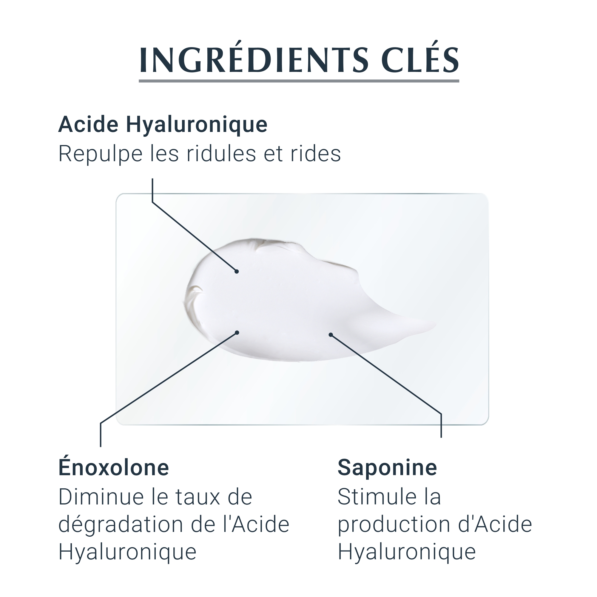 contre le processus de vieillissement cutané grâce au [HYAL] COMPLEX : 1 - COMBLE : L'Acide Hyaluronique de haut et bas poids moléculaire hydrate la peau et comble les rides. 2 - STIMULE : La Saponine stimule la production naturelle d'Acide Hyaluronique. 3 - PROTÈGE : L'Enoxolone diminue le taux de dégradation de l'Acide Hyaluronique. Le Dexpanthénol concentré soutient le processus de régénération cutanée pendant la nuit. Résultats : Lutte contre le processus de vieillissement cutané, pour une peau à l'apparence plus jeune, plus lisse et éclatante. Des études cliniques et dermatologiques le prouvent : Très bonne tolérance cutanée et efficacité. Ne pas conserver à plus de 25°C. Évitez le contact avec les yeux. Points clés du produit : • Complexe Hyaluronique Avancé : Hydrate intensément et comble les rides visibles. • Stimulation Naturelle : Stimule la production d'Acide Hyaluronique pour un effet de comblement. • Protection Anti-Dégradation : Réduit la dégradation de l'Acide Hyaluronique dans la peau. • Régénération Nocturne : Soutient activement le processus de régénération de la peau pendant la nuit. • Tolérance Cutanée : Cliniquement prouvée pour une peau plus jeune et éclatante. |