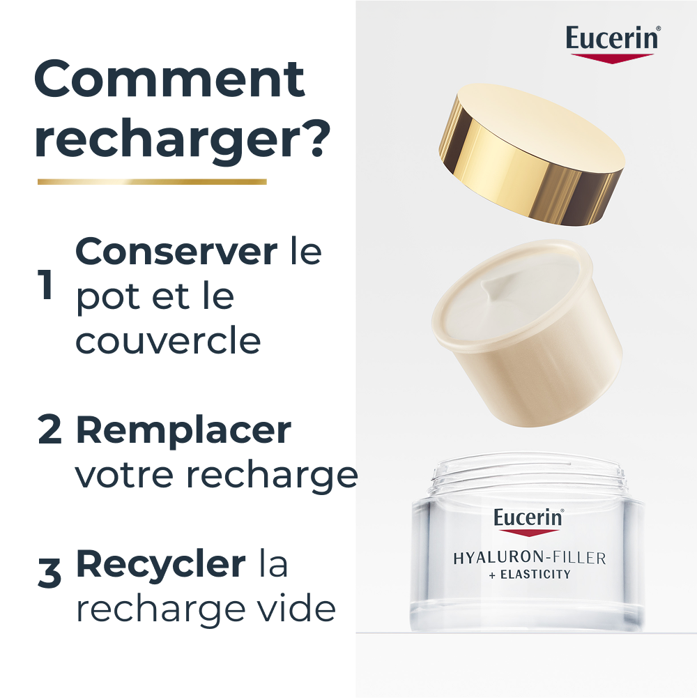 [Cet avis a été recueilli en réponse à une offre.] J’utilise depuis peu la Eucerin HYALURON-FILLER + Elasticity et je suis conquise . La texture est agréable, pénètre rapidement et laisse la peau douce sans fini collant. Ce que j’aime encore plus : HYALURON-FILLER : un soin efficace qui hydrate et redonne de l’élasticité à la peau. Recharge intelligente : en utilisant cette recharge, vous pouvez aider à réduire les déchets plastiques . Compatible avec tous les pots de soin du visage Eucerin . Un geste beauté qui prend soin de la peau et de la planète