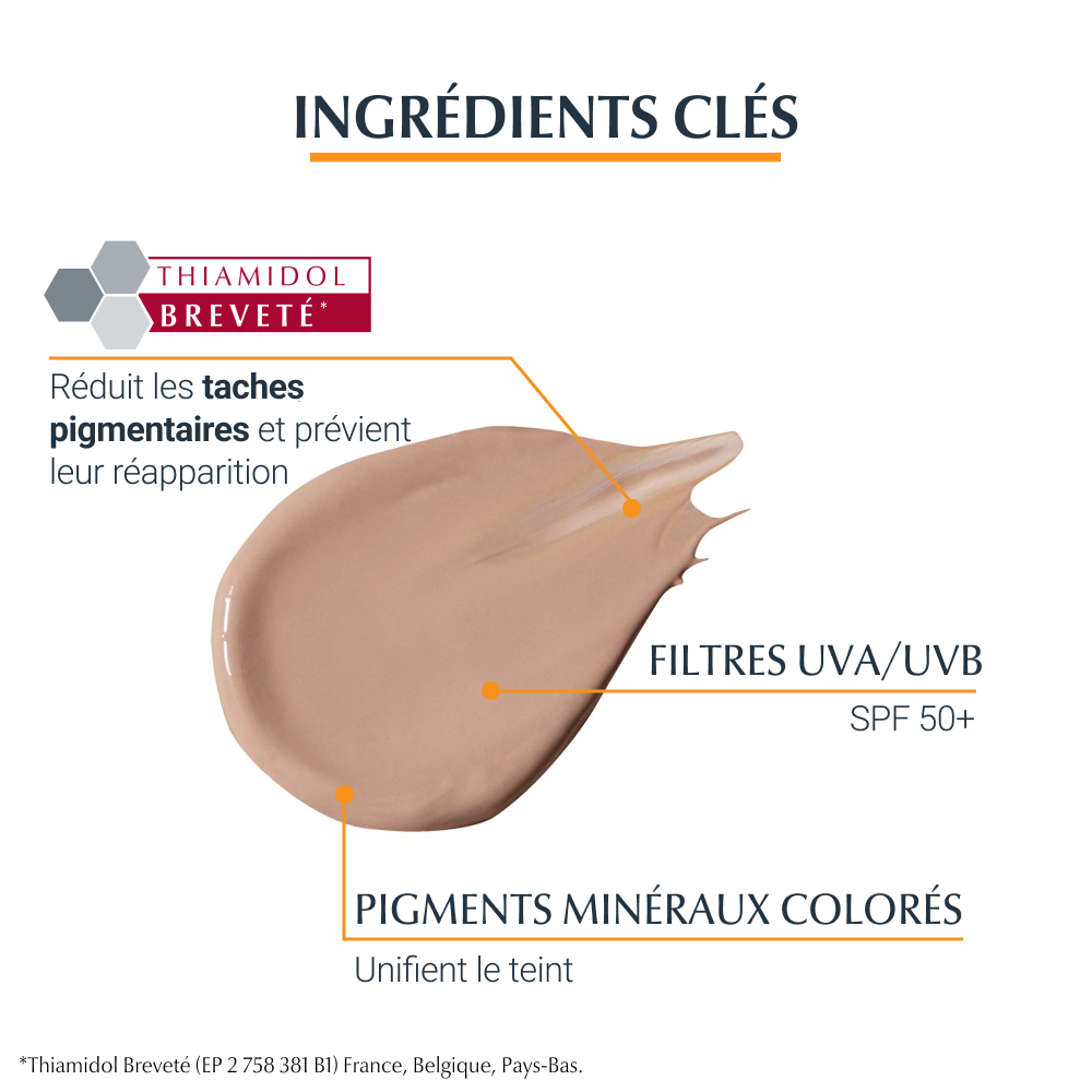 - Des pigments colorés pour couvrir immédiatement les taches et irrégularités du teint, et procurer une protection supplémentaire contre la pigmentation induite par la lumière visible de haute énergie.