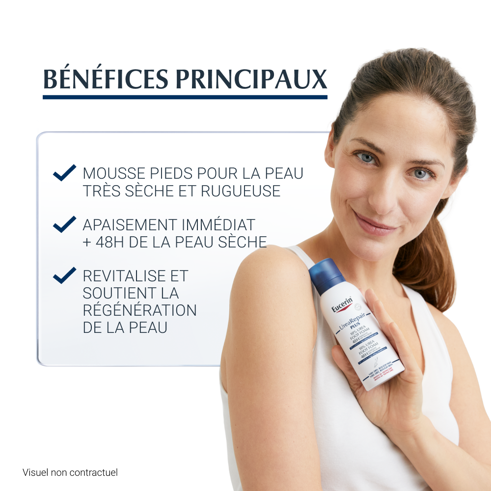 La mousse Eucerin Urearepair Plus Mousse Pieds 10% D’urée 150ml ultra-légère apaise immédiatement la peau sèche et laisse une sensation agréable sur la peau. - Avec 10% d'Urée, des Céramides, du Dexpanthénol et du Décanédiol. - Revitalise et soutient la régénération de la peau. - Hydrate intensément. - Réduit les callosités et l'épaississement de la peau. - Très bonnes efficacité et tolérance cutanée. 1. Bien secouer avant utilisation