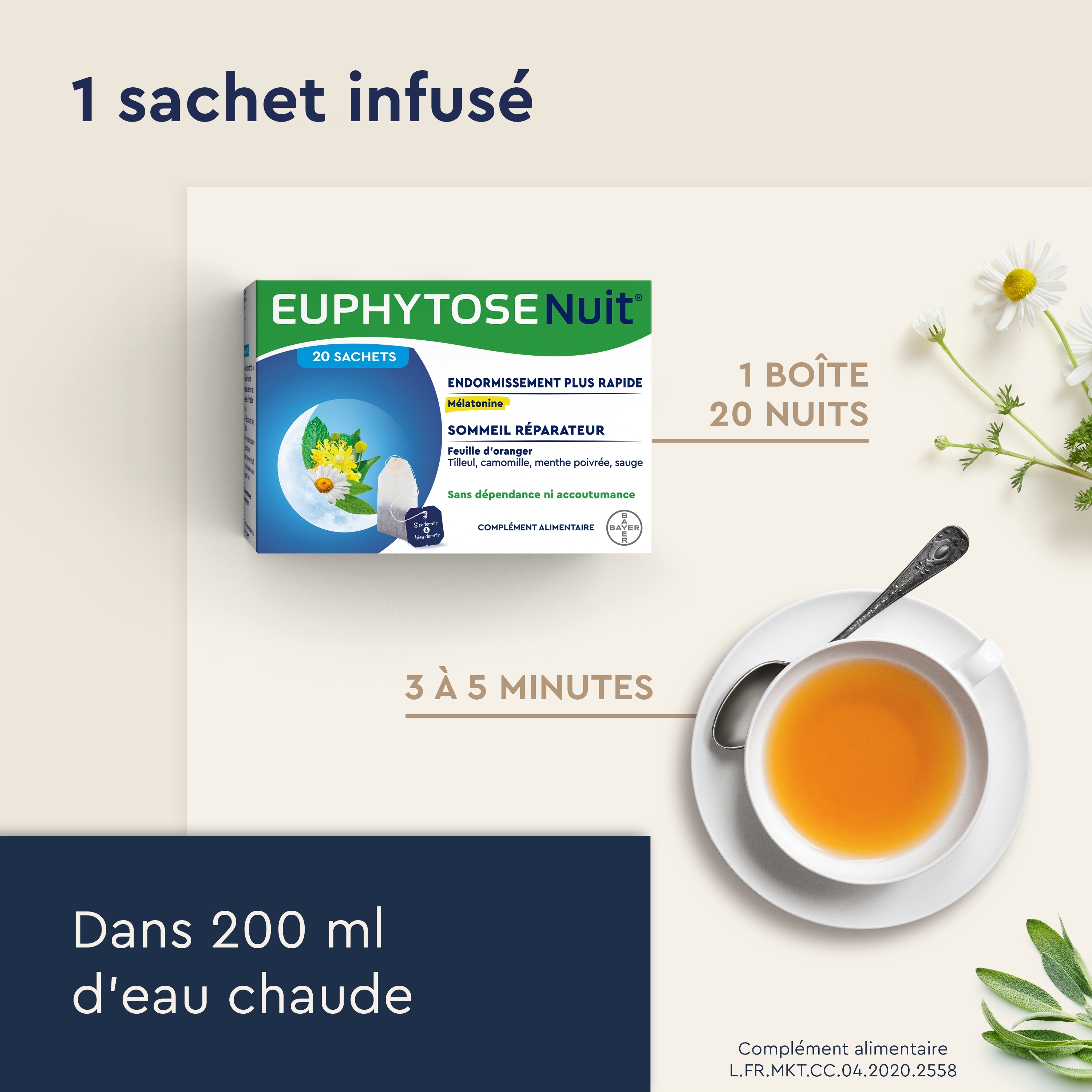 Simple d’utilisation : - Infuser 1 sachet dans 200 ml d’eau chaude. Toujours utiliser de l’eau tout juste bouillie et placer le sachet en premier avant de verser l’eau. - Attendre 3 à 5 minutes avant de prendre EuphytoseNuit en sachet. - Complément alimentaire en usage ponctuel ou en programme de 20 jours. EuphytoseNuit est un complément alimentaire à utiliser en complément d'une alimentation variée et équilibrée, et d'un mode de vie sain.