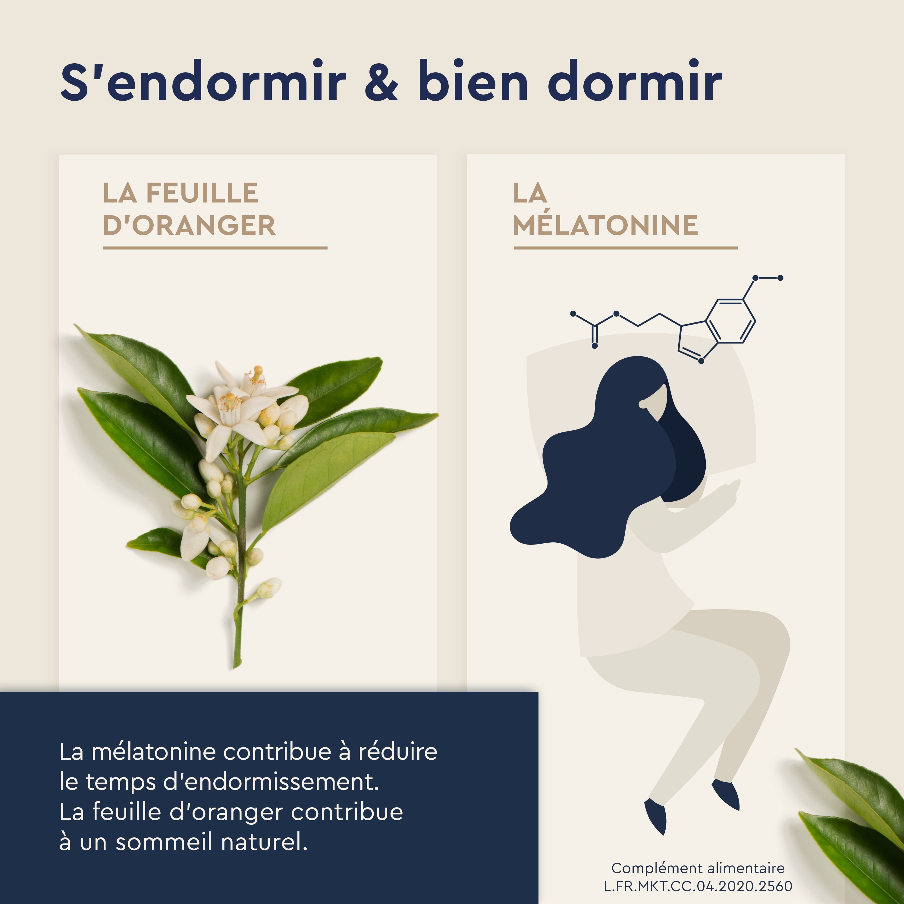Ingrédients : Feuille d’oranger amer ; fleur de tilleul argenté ; capitule de matricaire camomille ; feuille de menthe poivrée ; feuille de sauge ; agents de charge : E460 , E421 ; maltodextrine (maïs) ; mélatonine.