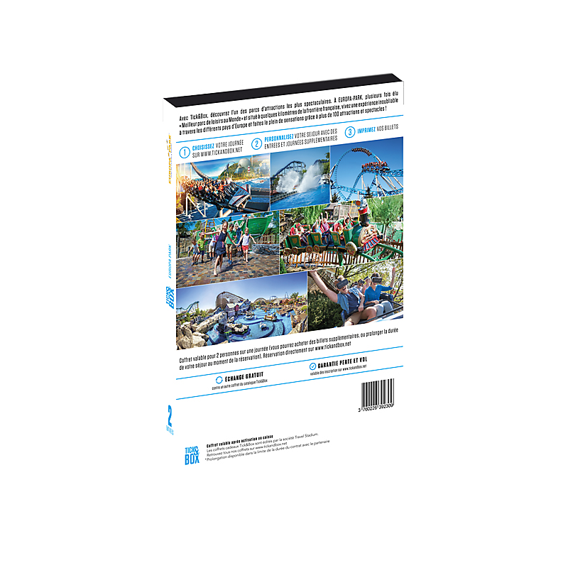 A Europa-Park, élu plusieurs fois "meilleur parc de loisirs au monde" et situé à quelques kilomètres de la frontière française, vivez une expérience inoubliable à travers les différents pays d'Europe et faites le plein de sensations grâce à plus de 100 attractions et spectacles. Avec Tickn'Box, plongez dans l'univers des plus beaux parcs à thèmes d'Europe. Dans votre Tickn'Box, vous découvrirez : Un chèque cadeau échangeable contre 2 entrées pour une journée. Ce chèque permet de réserver votre séjour en vous connectant sur le site tickandbox.net. Le coffret est valable pour 2 places, 24 mois à compter de sa date d’achat. Tickn'Box est revendeur officiel d'Europa-Park. Choisissez votre journée et vivez une expérience unique. Votre séjour est totalement personnalisable lors de votre réservation en ligne (ajout d'entrées ou de journées supplémentaires au meilleur prix du moment)