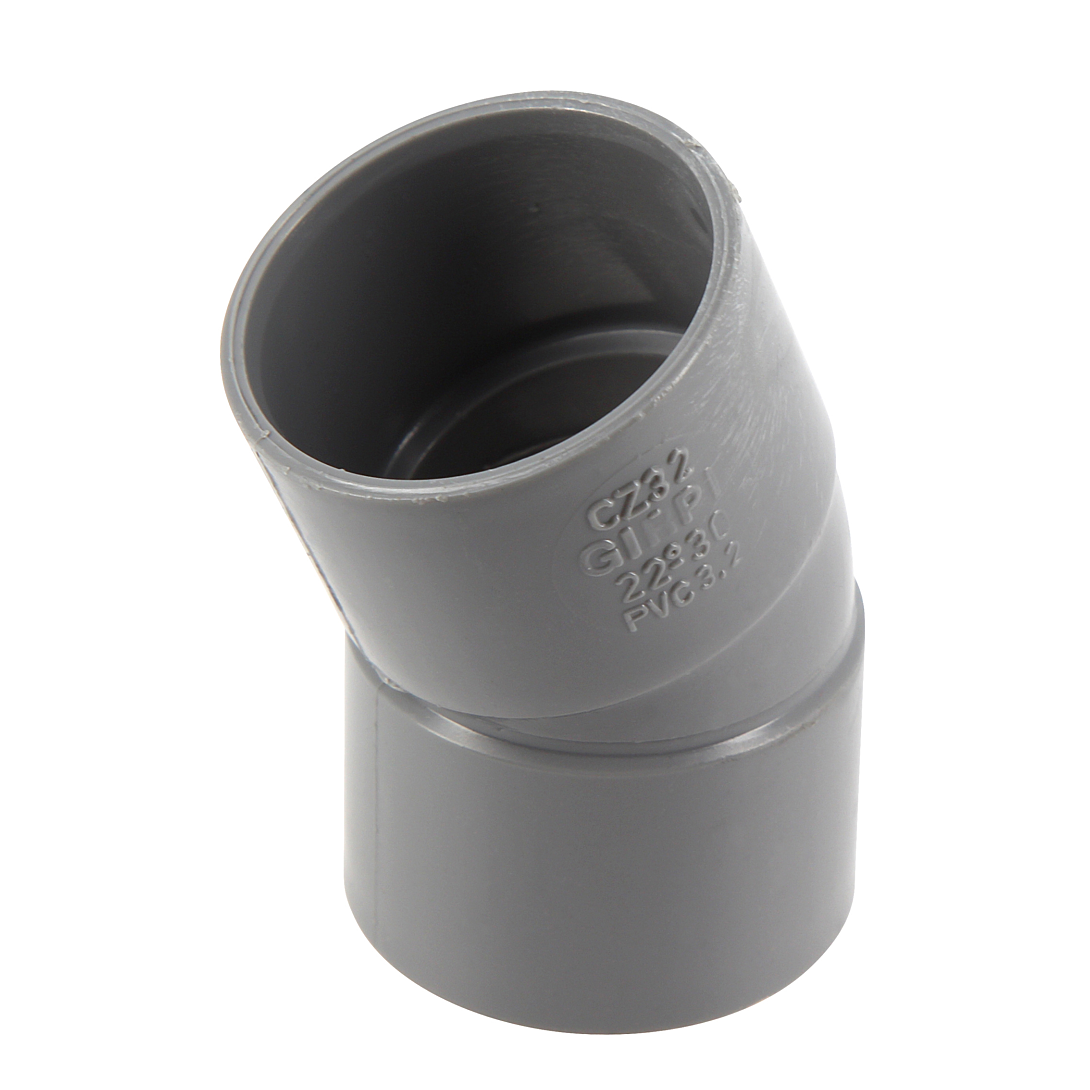 Coude Ø 32 mm, femelle-femelle à 22°30, à coller, gris, en PVC lisse non microporeux, matériau recyclable, pour l'évacuation des eaux usées et des eaux vannes, absorbe la dilatation des tuyaux, marquages NF E et NF Me "réglementation feu"