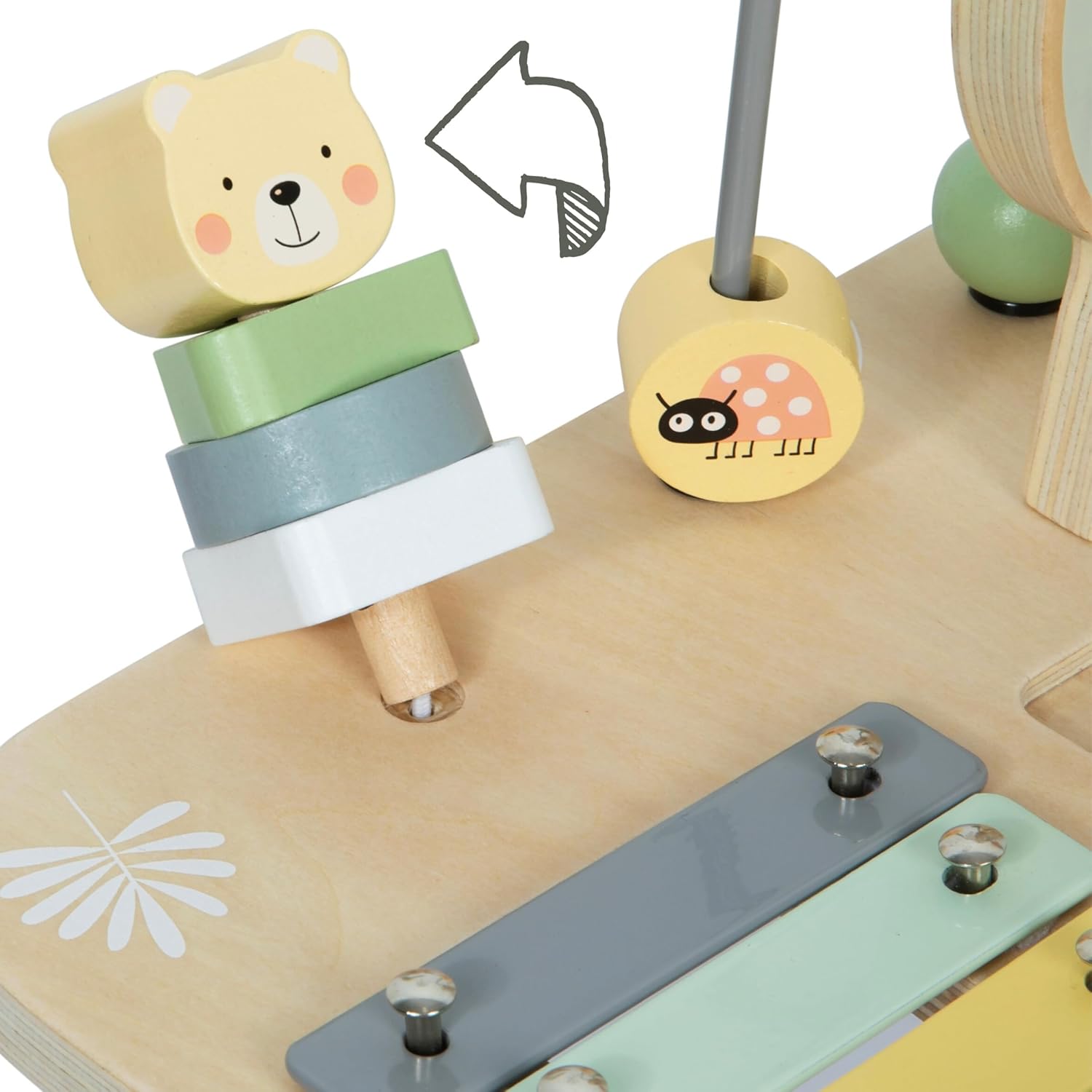 Vous recherchez un jouet dont votre enfant aura du mal à se détacher ? La table en bois Wild Jungle est un choix parfait ! Il attirera l'attention de votre enfant par son design moderne, plein de couleurs délicates, et lui permettra de se divertir de différentes manières. Le tout-petit peut jouer des cymbales, frapper le gong avec une matraque spéciale, déplacer des animaux le long d'une piste désignée, trier des formes, faire tourner des rouages, déplacer des éléments colorés le long d'un fil métallique ou les placer sur un piquet en bois. C'est un cadeau fantastique pour n'importe quel bébé !