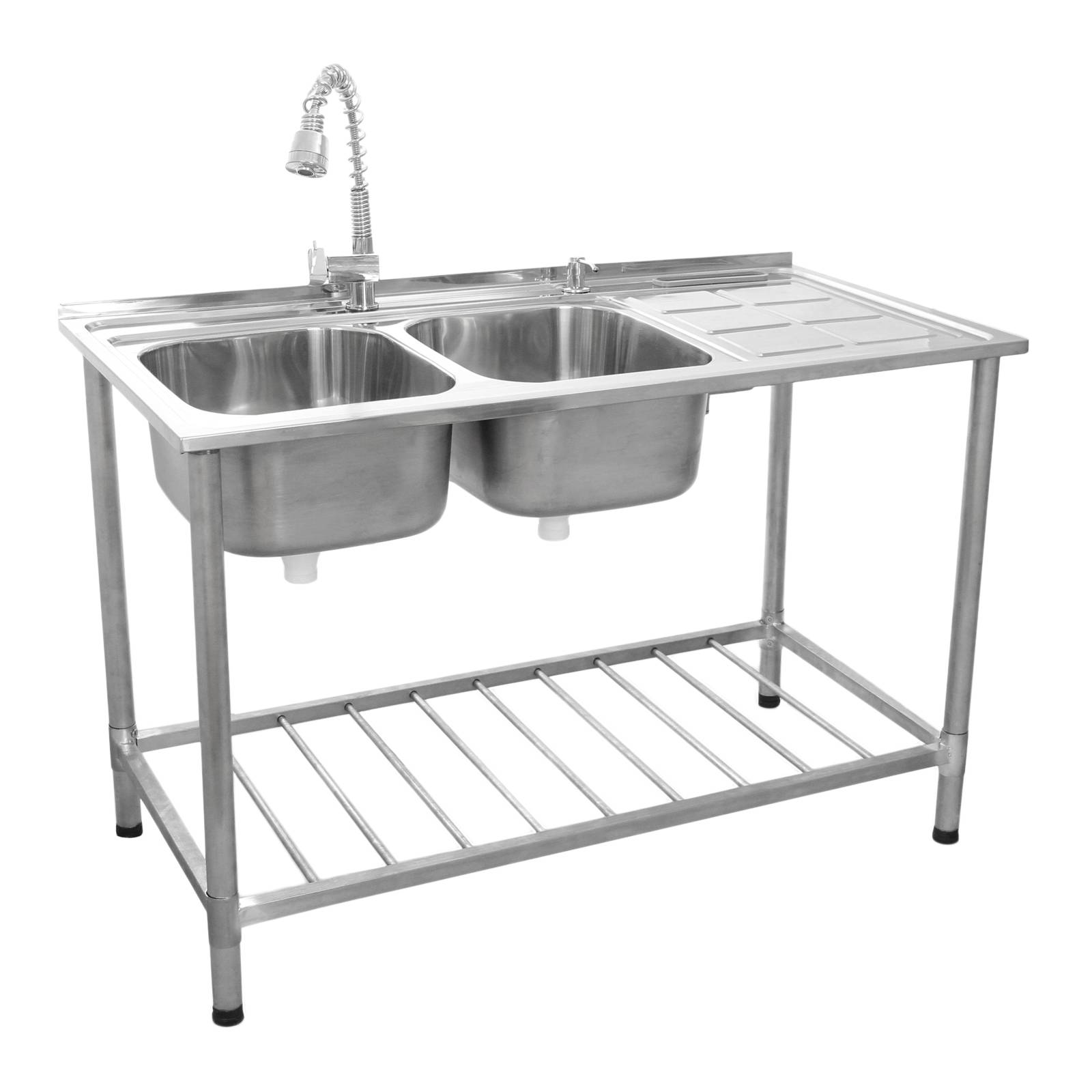 Libellé Evier Professionnel /Plonge sur Pied à Doubles Bacs en Acier Inoxydable avec Etagère de Rangement Inférieure et Robinet