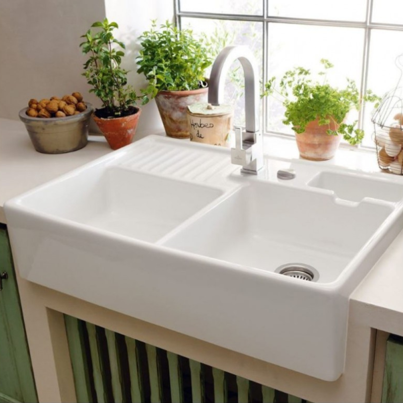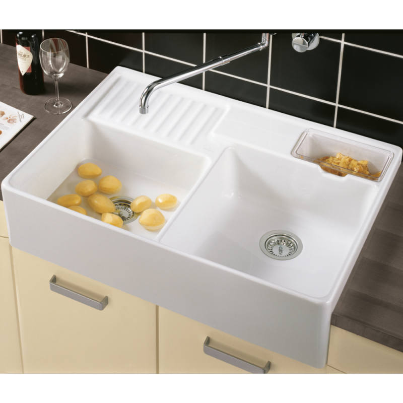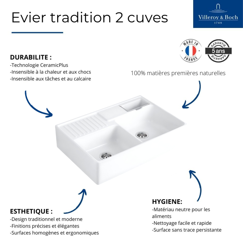 Evier timbre d'office VILLEROY ET BOCH Tradition 2 bacs 89,5 x 63 céramique vidage manuel blanc + Cache b