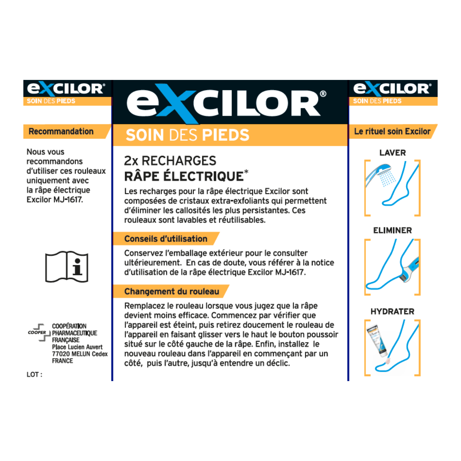 Les recharges pour la râpe électrique Excilor sont composées de cristaux extra-exfoliants qui permettent d'éliminer les callosités les plus persistantes. Ces rouleaux sont lavables et réutilisables.