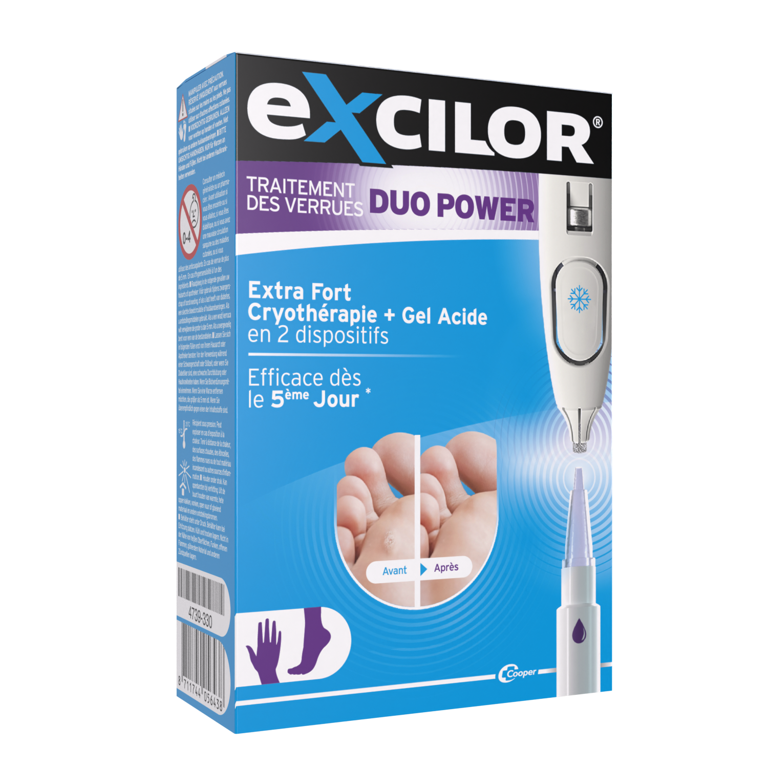 Pour qui : Adultes - Mains et Pieds Indications : Traitement des verrues Contenu du kit : Duo de deux stylos traitants Résultats : Les verrues disparaissent en seulement 5 jours Le Traitement des Verrues Duo Power de EXCILOR est un traitement qui permet d'éliminer rapidement les verrues présentes sur les mains et/ou sur les pieds. Ce traitement se présente sous la forme d'un duo de stylos qui utilisent la cryothérapie : le stylo vient congeler la verrue pour faciliter son élimination. En seulement cinq jours, les verrues disparaissent. Le traitement est entièrement indolore. Ce produit est un dispositif médical.