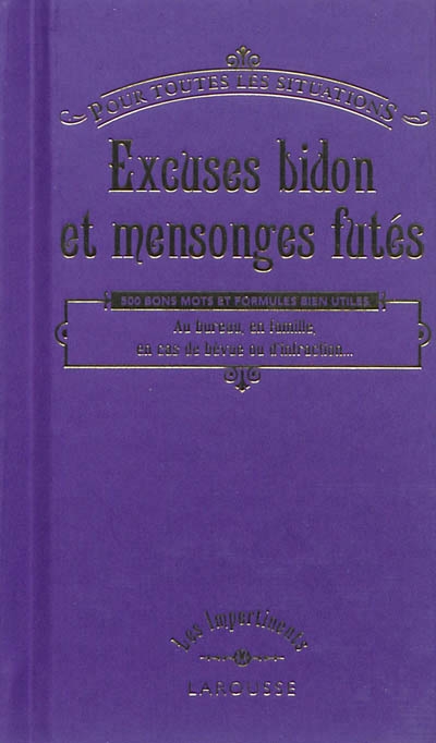 Excuses bidon et mensonges futés (pour toutes les situations) Décalé, drôle, mais toujours efficace, ce guide de conversation vous aidera à en finir avec les bourdes , les oublis malencontreux et les excuses bricolées à la va-vite. Facile à transporter, il sortira de l'embarras toutes celles et ceux qui ont du mal à mentir ou sont en panne d'inventivité, en leur fournissant plus de 500 excuses et mensonges imparables, utiles au boulot, à la maison, au téléphone... Trouvez toujours les mots et la formule pour vous en sortir, quelle que soit la situation !